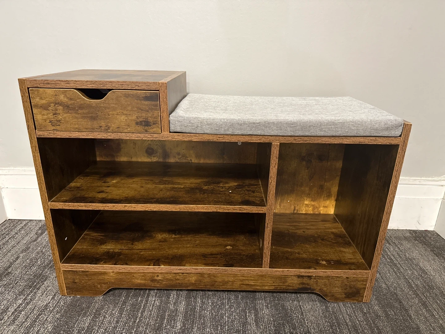 This rustic brown shoe storage bench is perfect for keeping your entryway organized! It comes pre-assembled and features a comfy grey cushion top, a drawer for small items, and two shelves for shoes. This item is in new condition, never been used! Add a touch of charm and functionality to your home with this lovely piece.