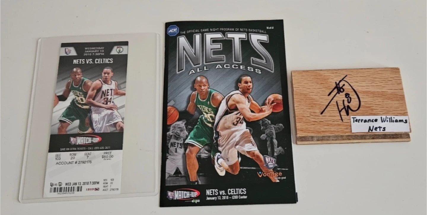 Terrance Williams NJ Nets Ticket, Program, signed floorboard