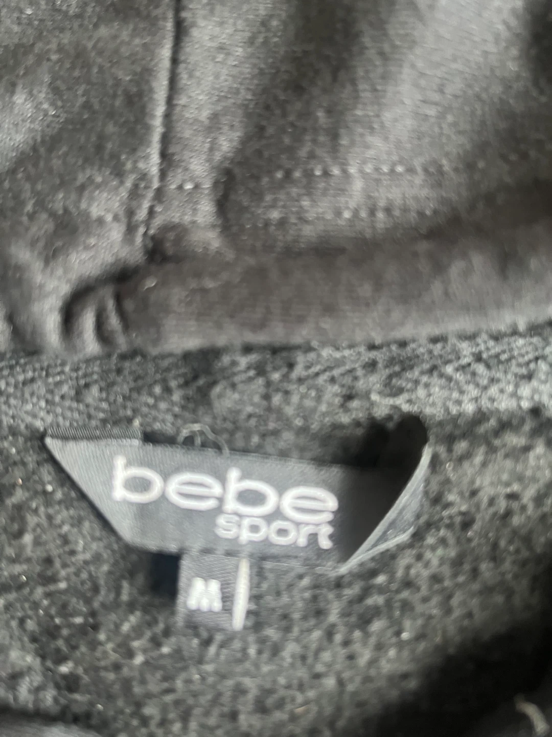 Black Bebe Sport hoodie and matching jogger set. Set is size medium. Hoodie has a front pocket and drawstring hood. Joggers have an elastic waistband with drawstring and pockets
