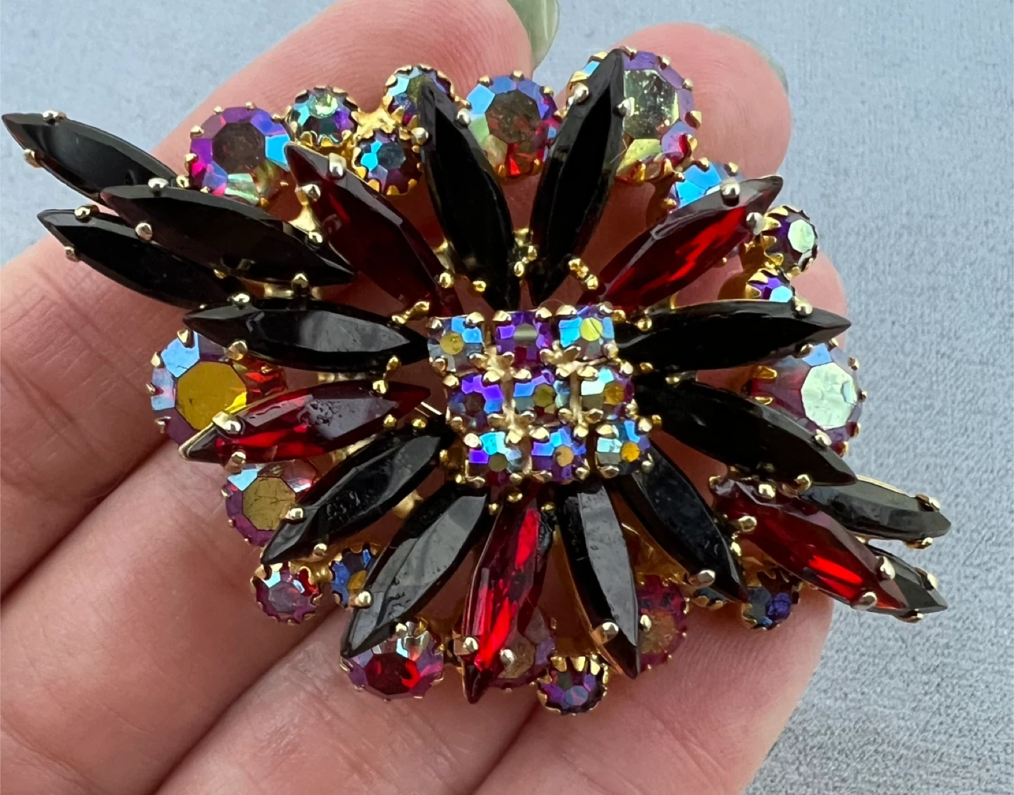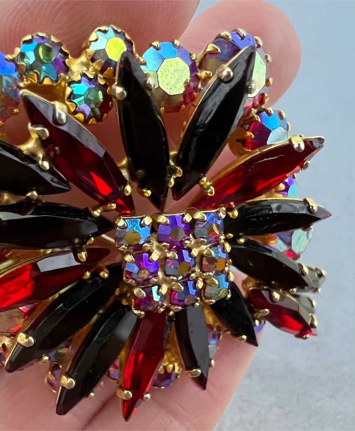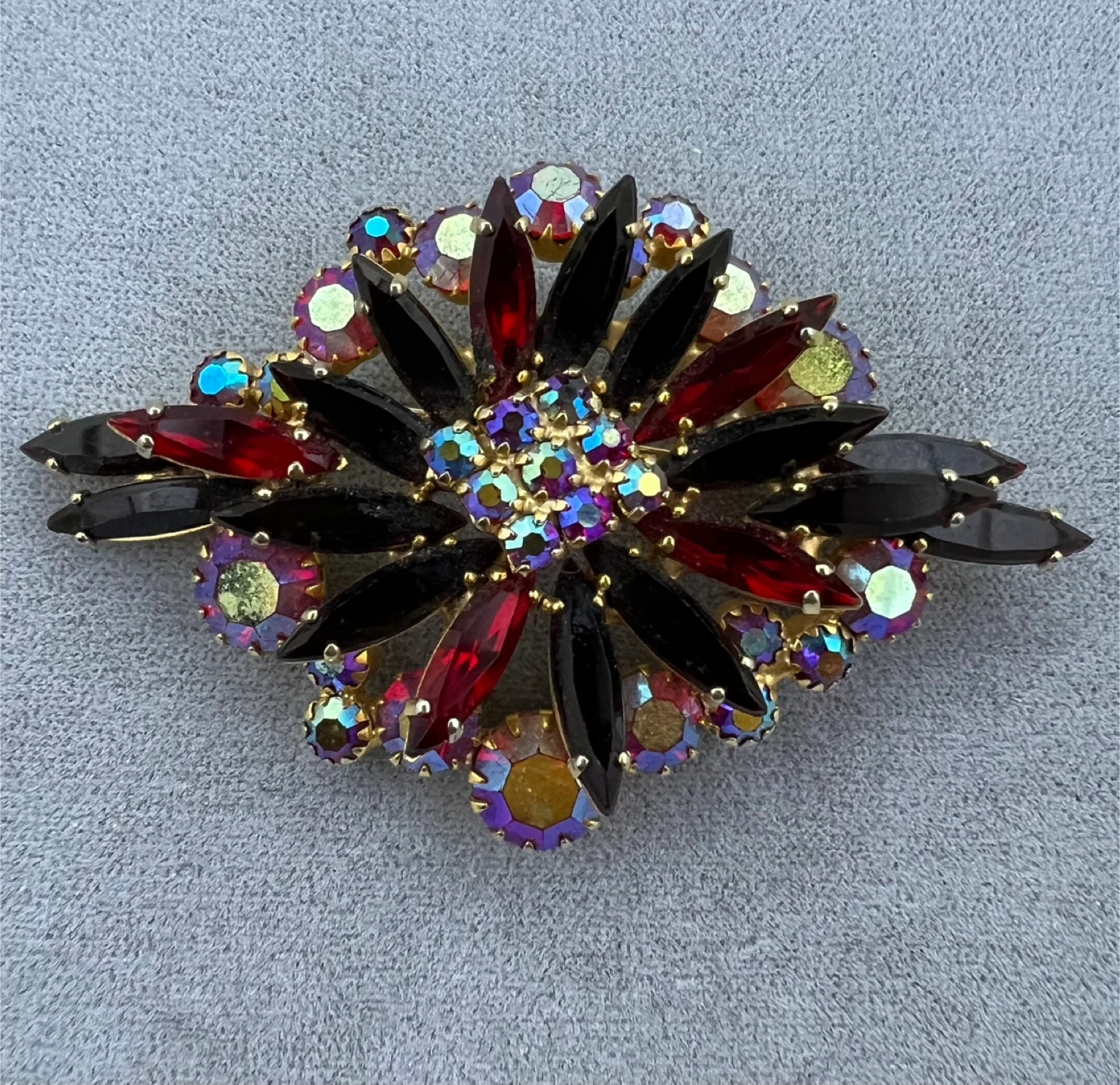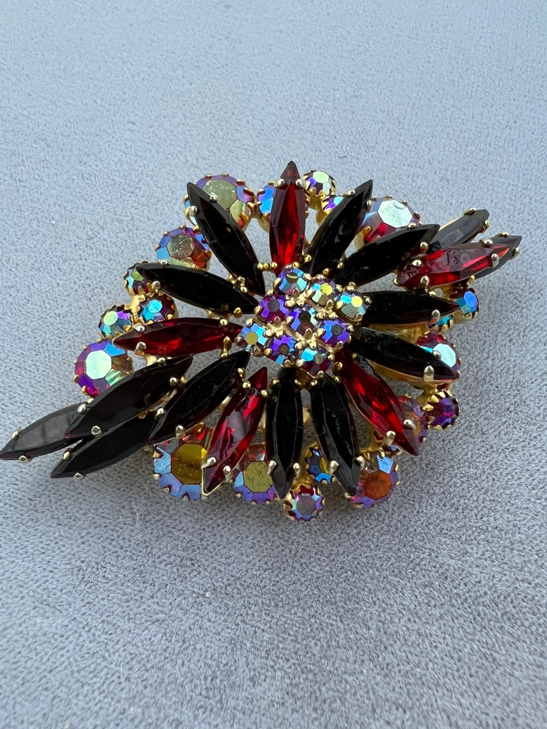 Beautiful starburst pattern with multifaceted red and iridescent rhinestones