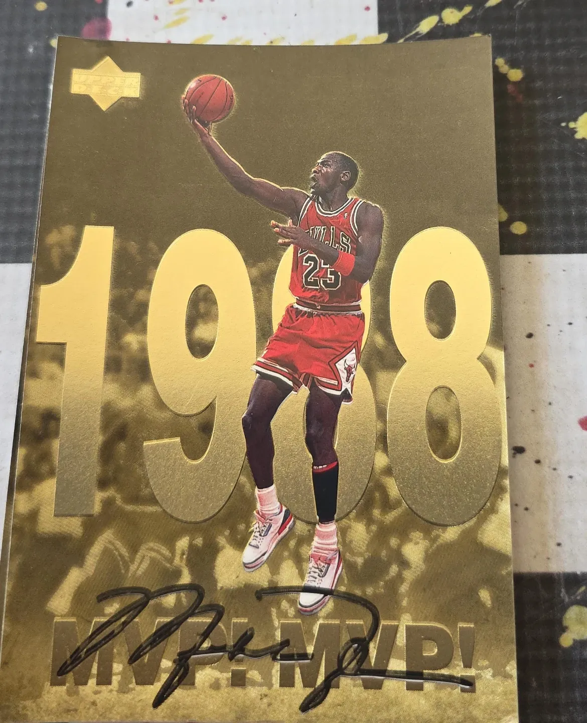 Selling a Michael Jordan 1998 MVP Upper Deck card. It's in great condition and features a gold design. Perfect for any basketball or sports card collector!