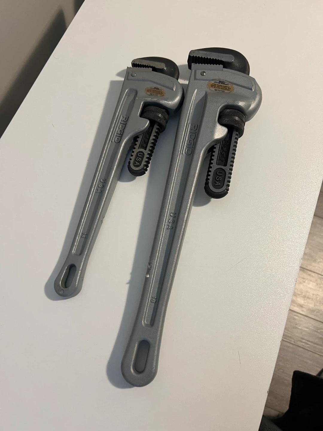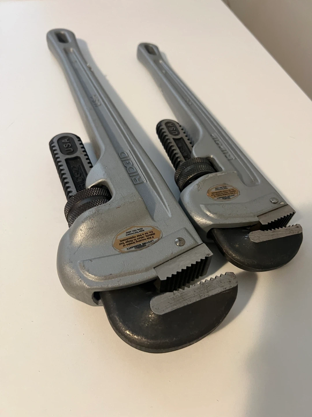 Two RIDGID aluminum pipe wrenches, 18” and 14”.