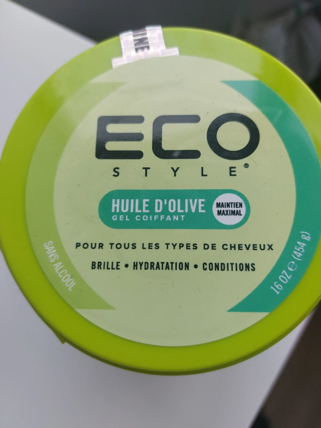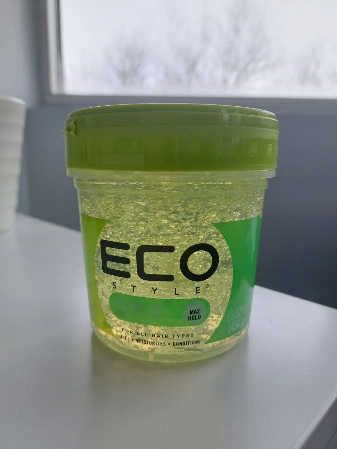 Eco Style Olive Oil Styling Gel for all hair types. It's a 16oz (454g) container that provides maximum hold, shine, hydration, and conditions your hair. It's also alcohol-free. Used once.