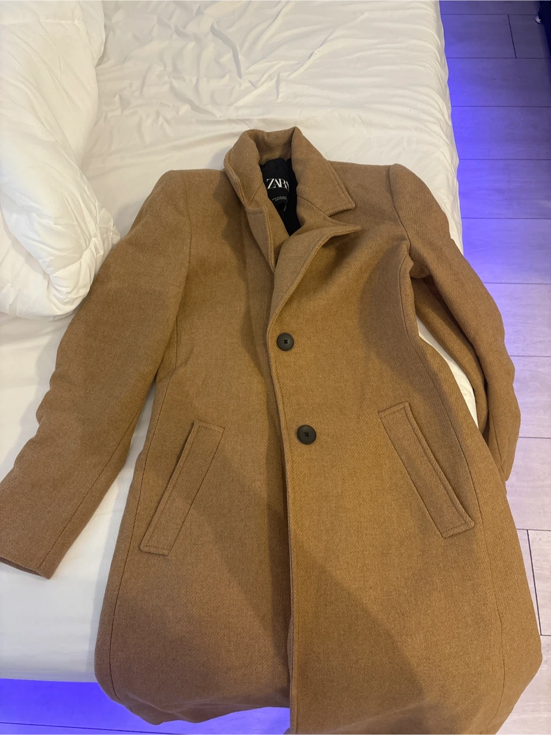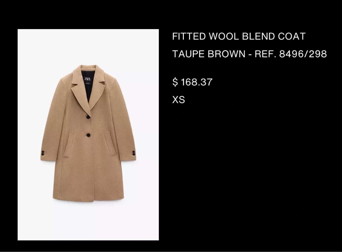 Selling a Zara fitted wool blend coat in a beautiful taupe brown color! It's a size XS and in great condition. The reference number is 8496/298. Originally bought for $168.37, this coat is a stylish and warm addition to any wardrobe