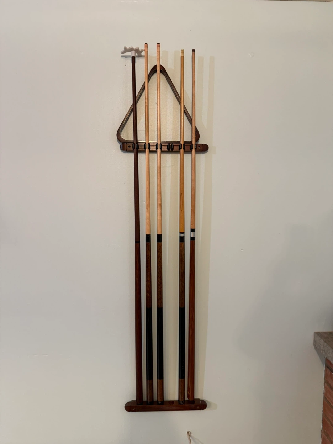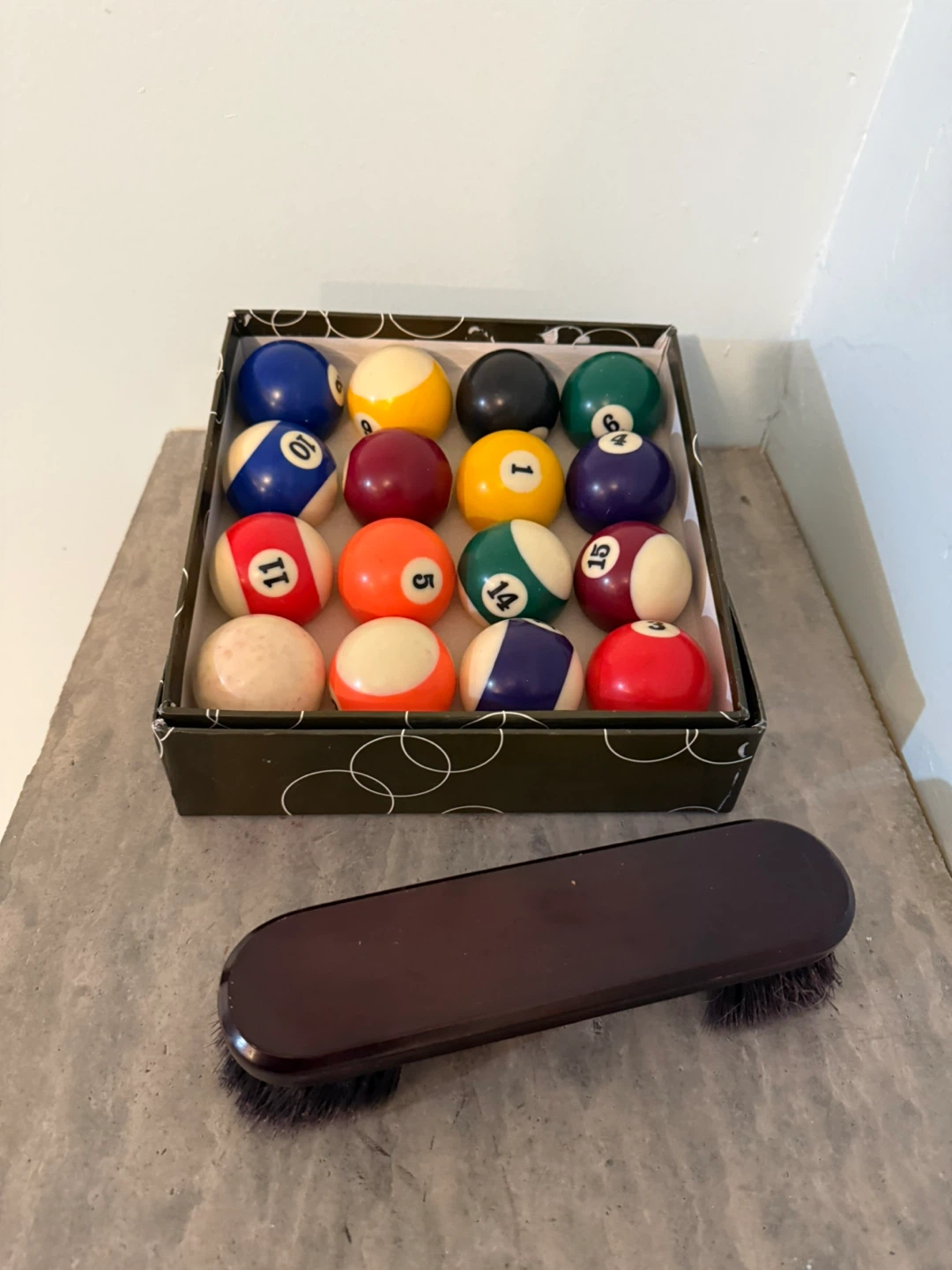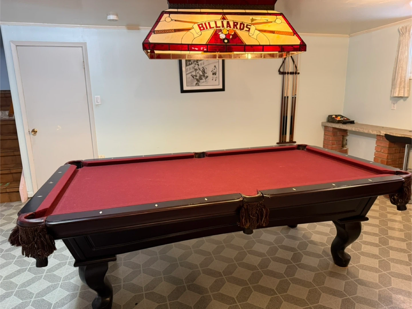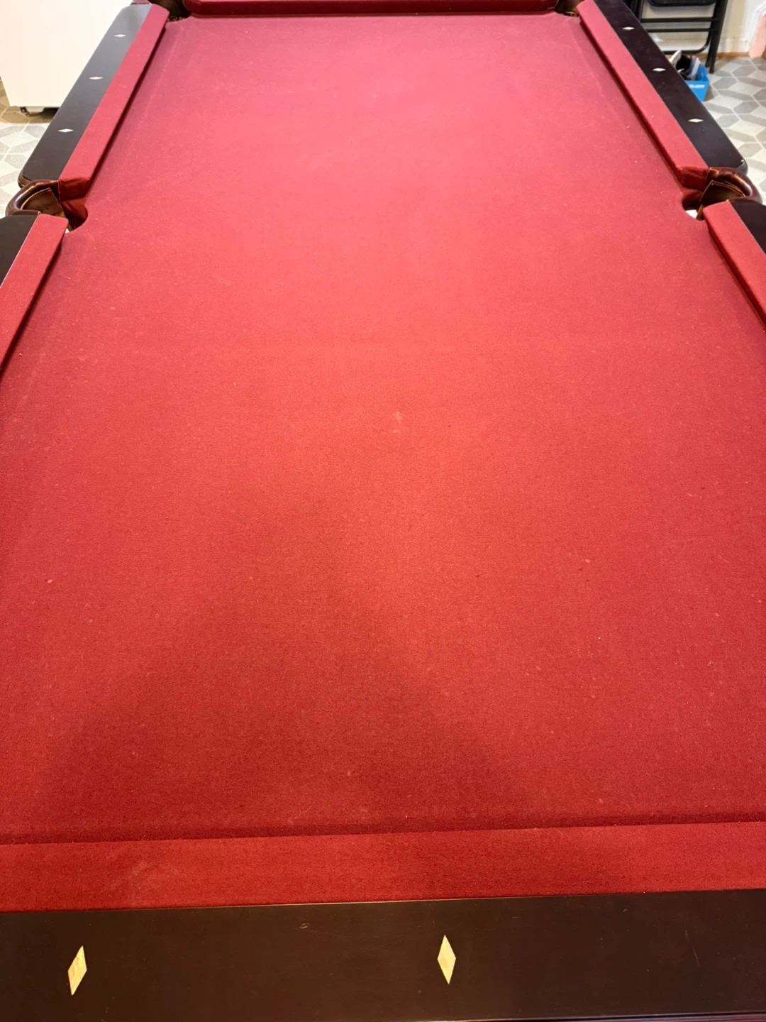 Selling a slate pool table with a red felt top. Included are pool balls, a brush, triangle, cover, billiards light and several pool cues. It's in well loved, good condition and ready for a new home!