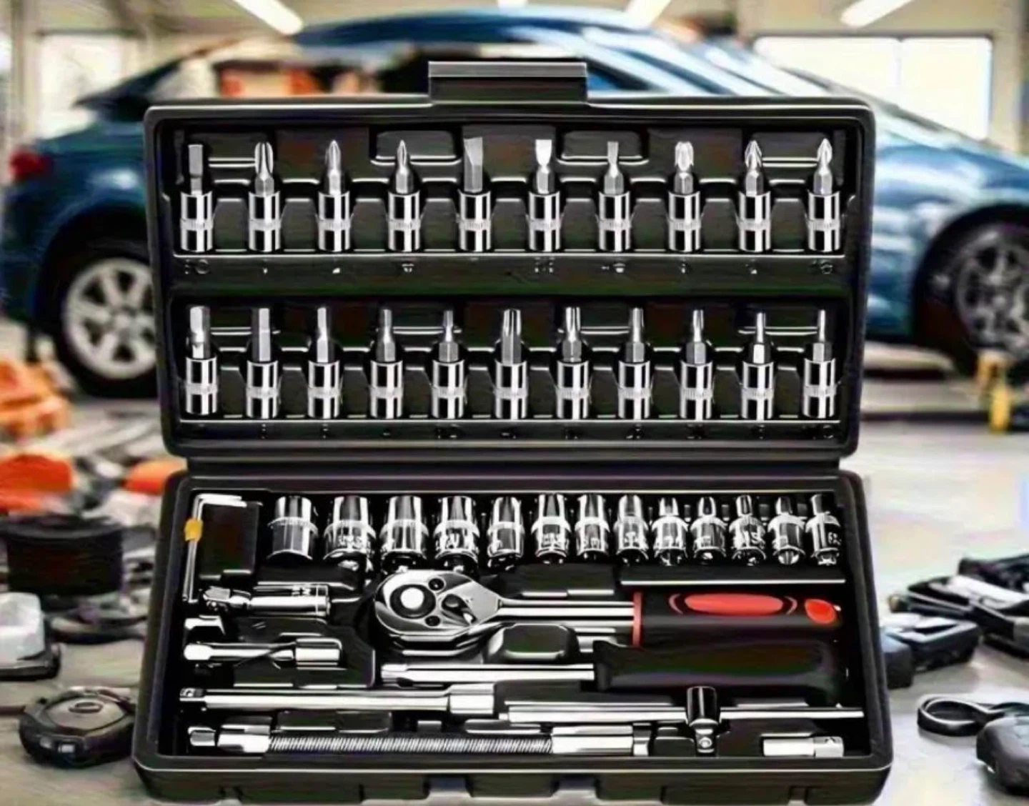 Selling a 46-piece socket wrench set with a 1/4" drive. It comes in a red case to keep everything organized and easy to carry. All the pieces are there and ready for your next project!