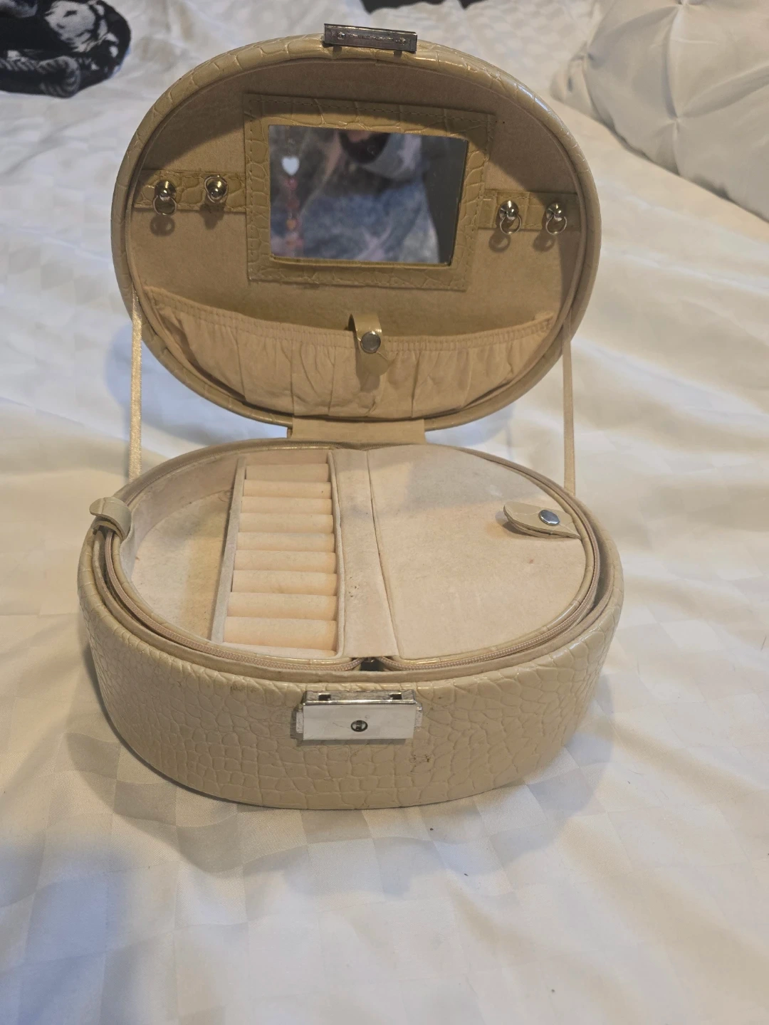 Here's a cute beige jewelry box! It's oval-shaped and perfect for keeping your jewelry organized. It has a mirror inside and different compartments for rings, necklaces, and other small items. It's in great condition and ready for a new home! $15