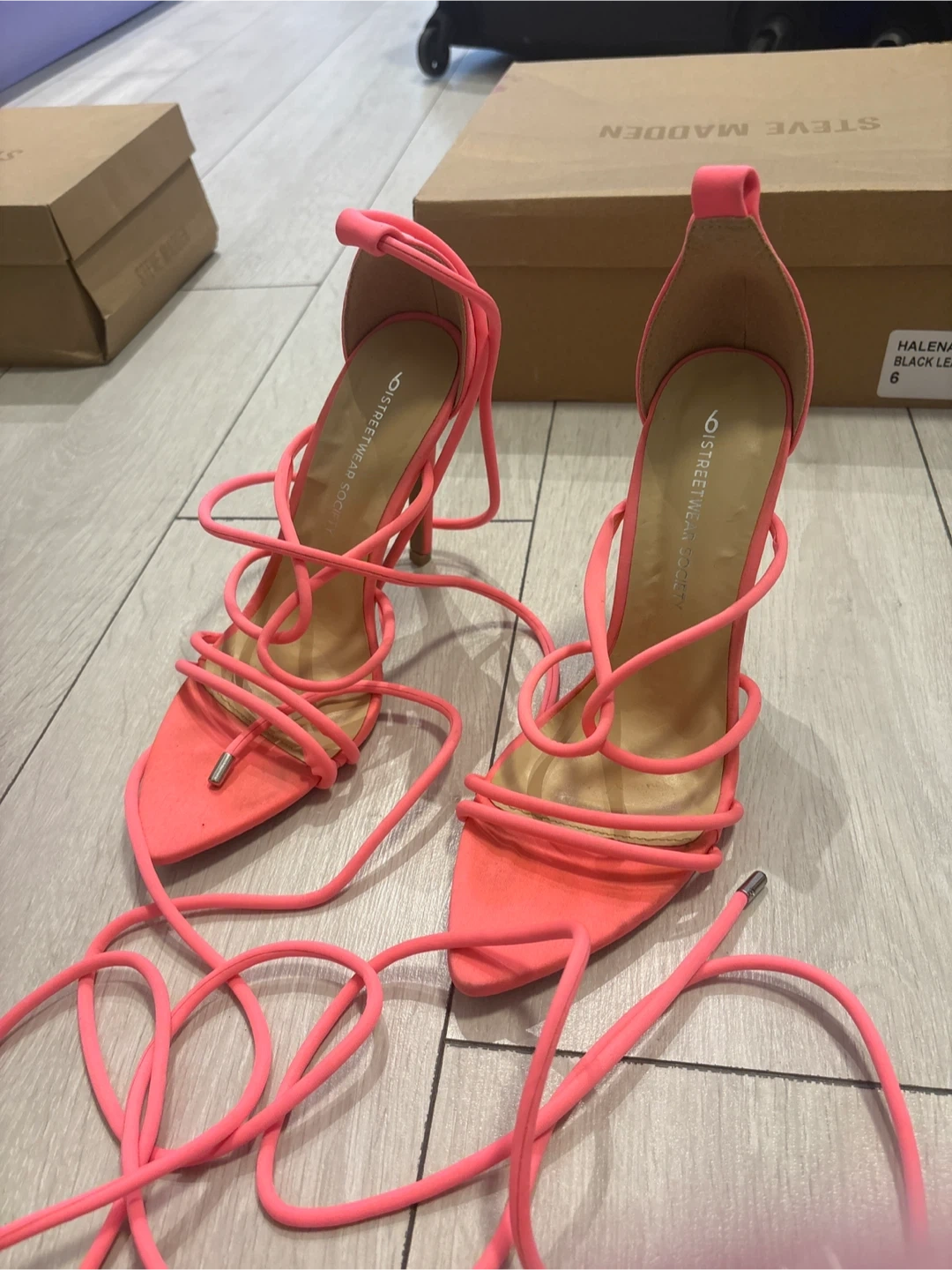 These vibrant pink heels from Streetwear Society are a fun addition to any wardrobe! They feature a unique strappy design and are a size 6. Originally bought for $39.99 and come with the box