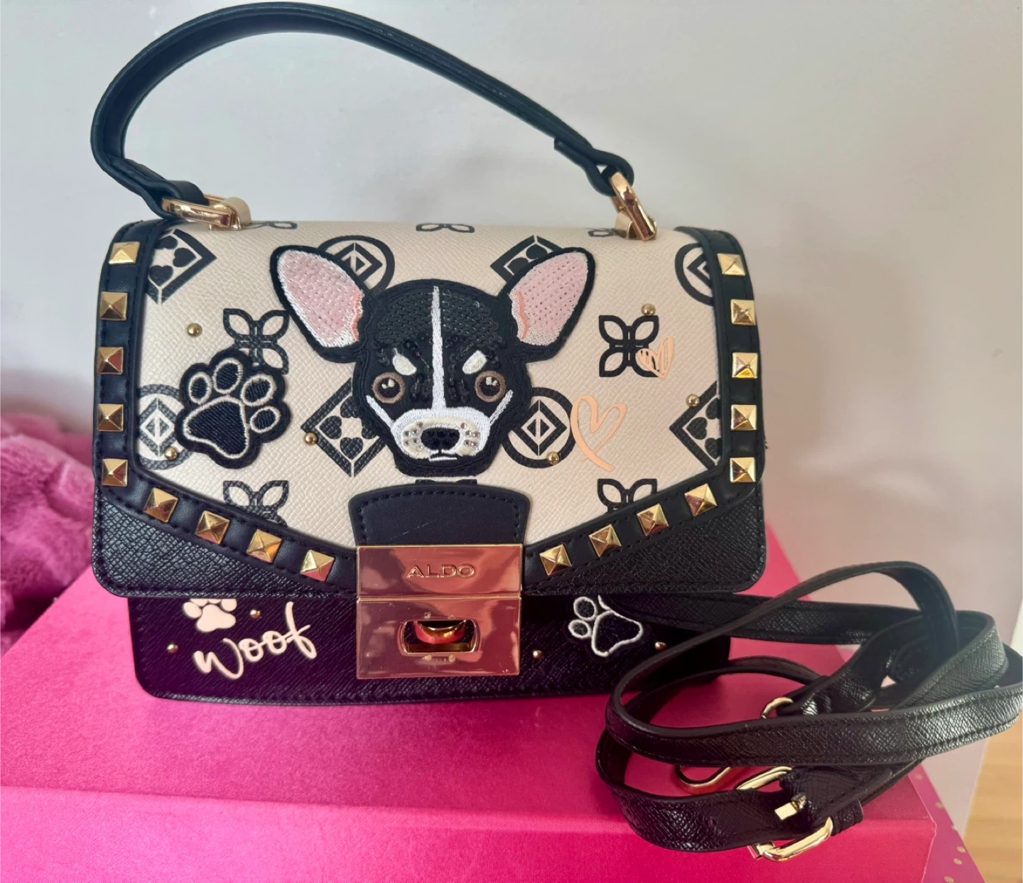 Super cute ALDO crossbody bag with a fun dog print! It features gold-tone hardware and a detachable strap. Perfect for adding a playful touch to any outfit