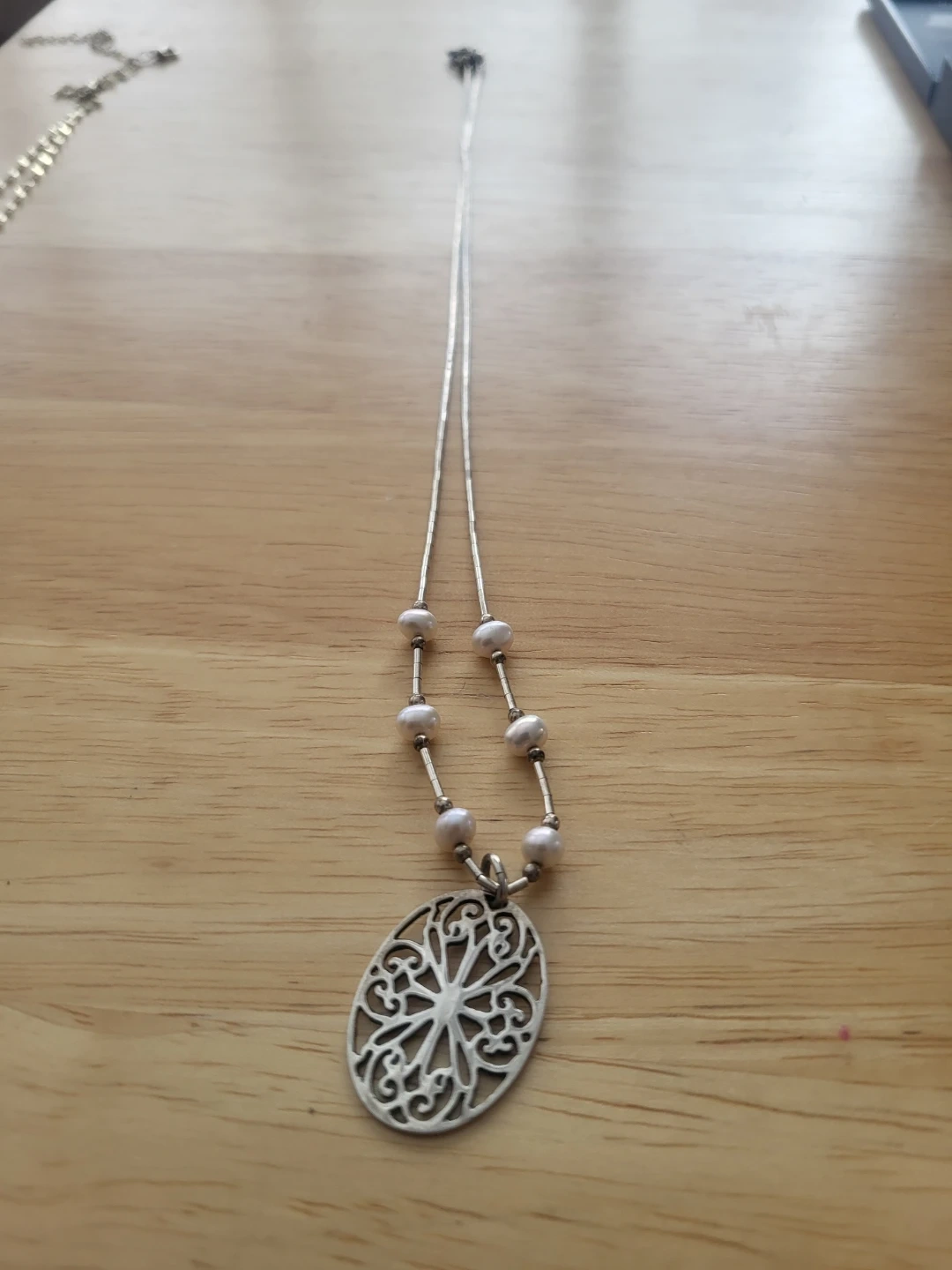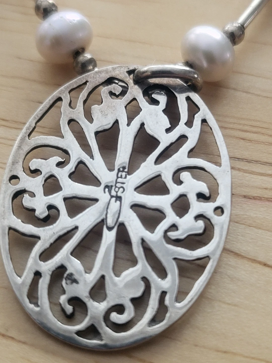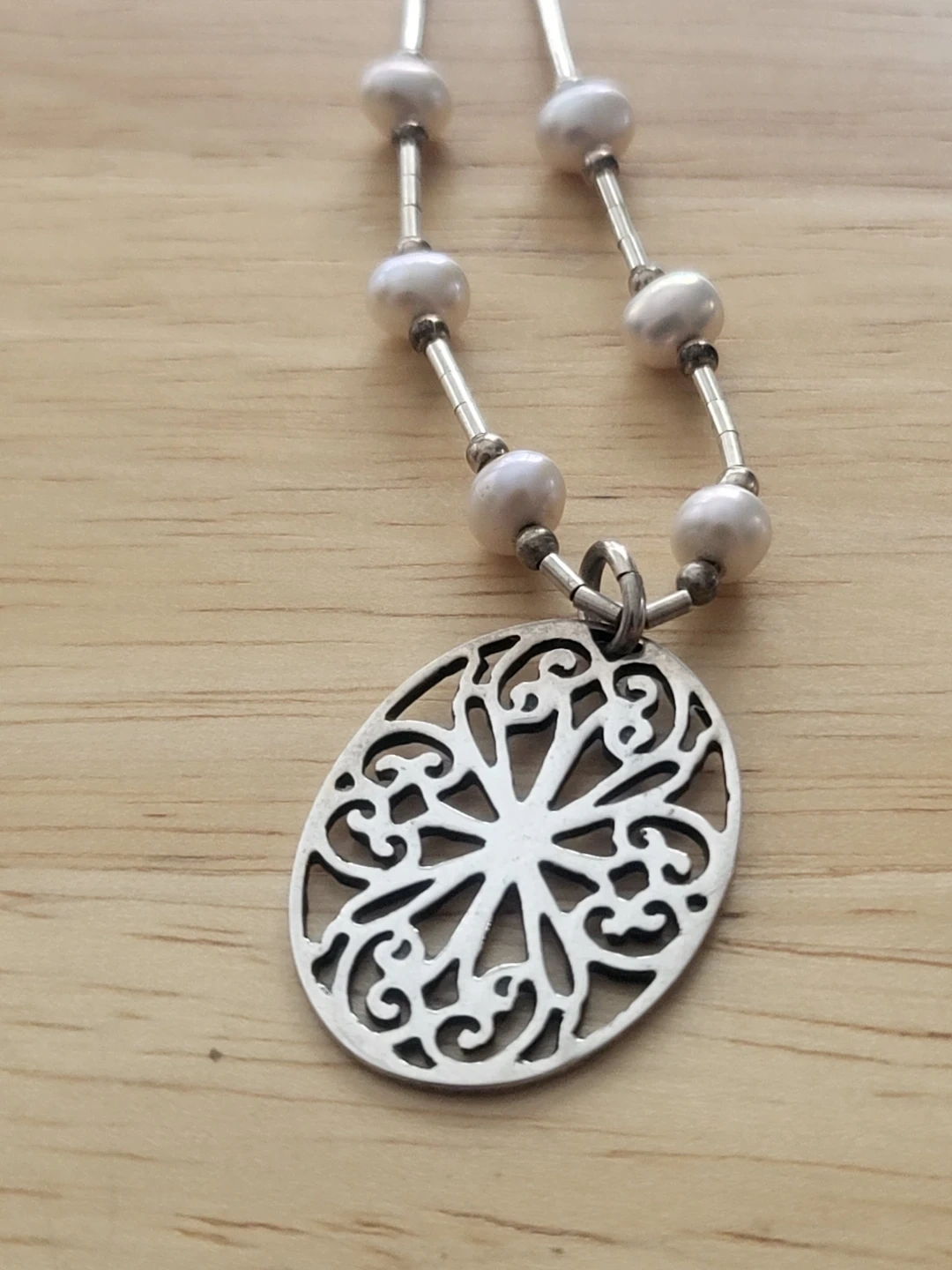 This is a lovely necklace made from sterling silver and freshwater pearls. The pendant has a beautiful filigree design. It's marked '925 STEP' on the back, confirming its silver content. It's in great condition and ready to wear! 18"