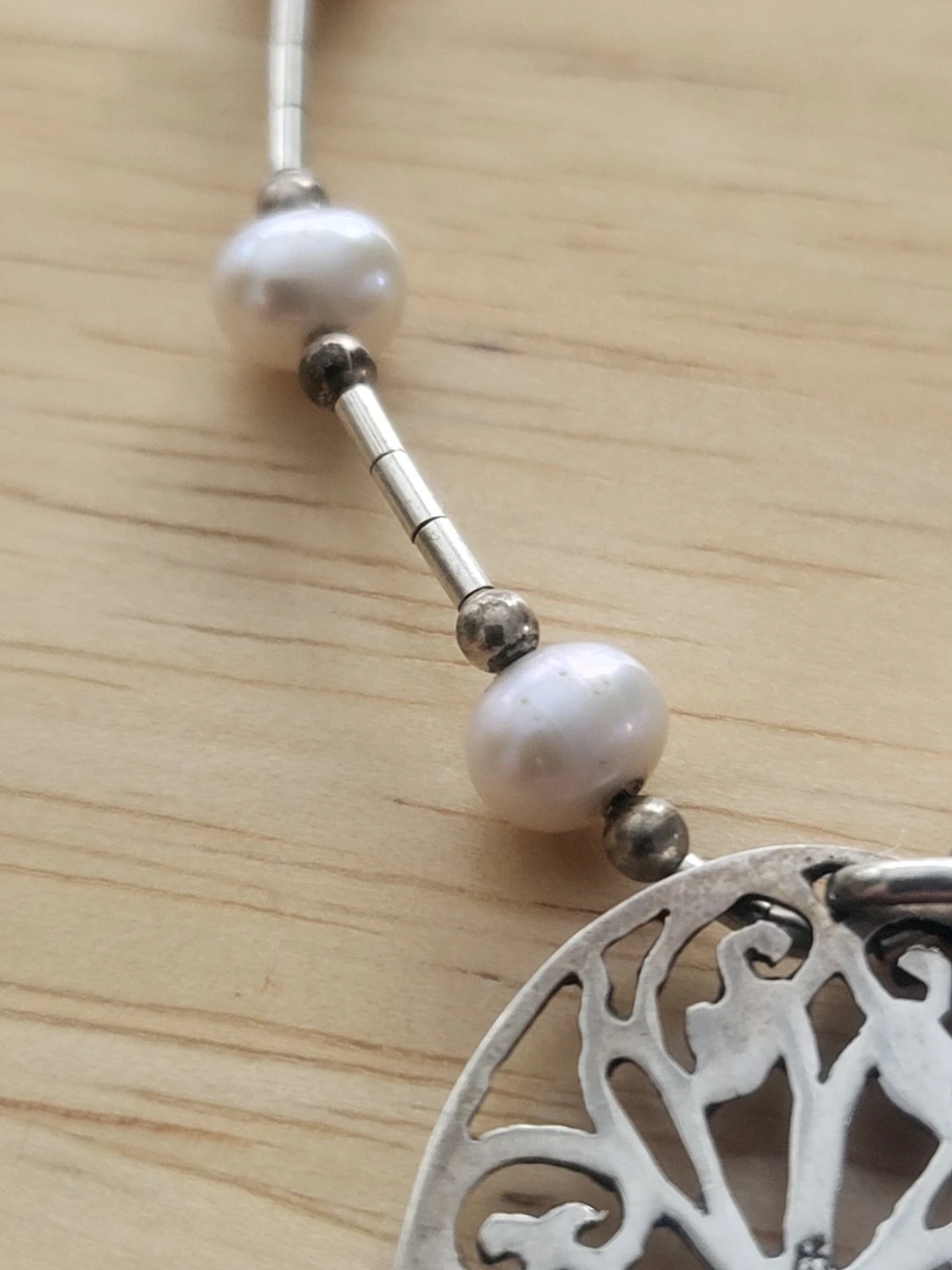 This is a lovely necklace made from sterling silver and freshwater pearls. The pendant has a beautiful filigree design. It's marked '925 STEP' on the back, confirming its silver content. It's in great condition and ready to wear! 18"