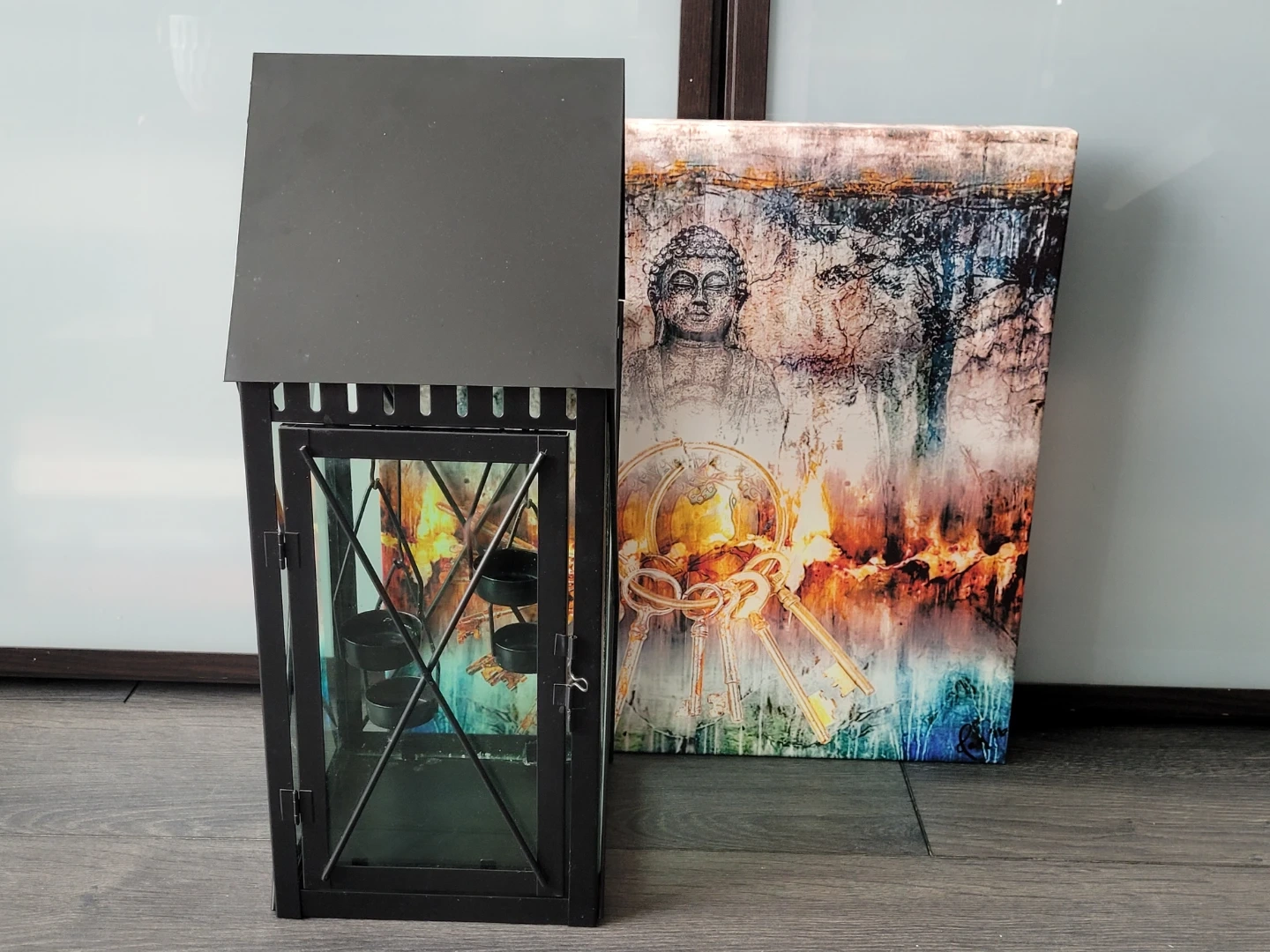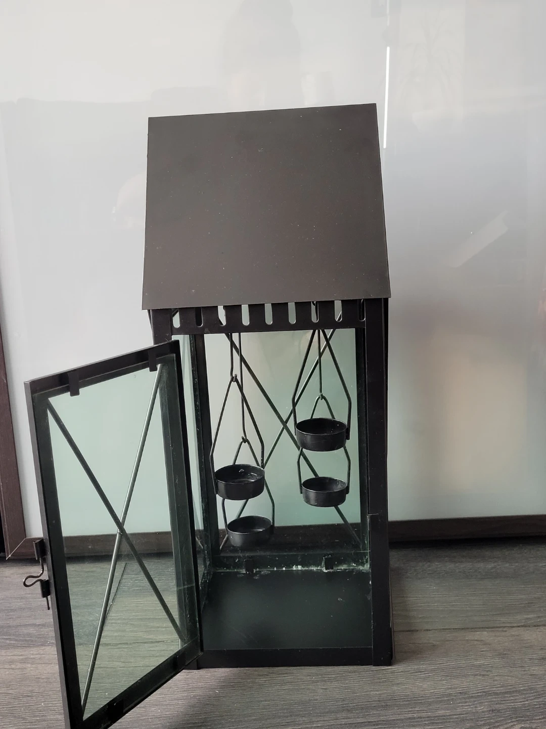 Selling a black metal candle lantern! It's in great shape and ready to add a cozy touch to your home. Perfect for creating a warm and inviting atmosphere, glass is small Crack in it on one side.