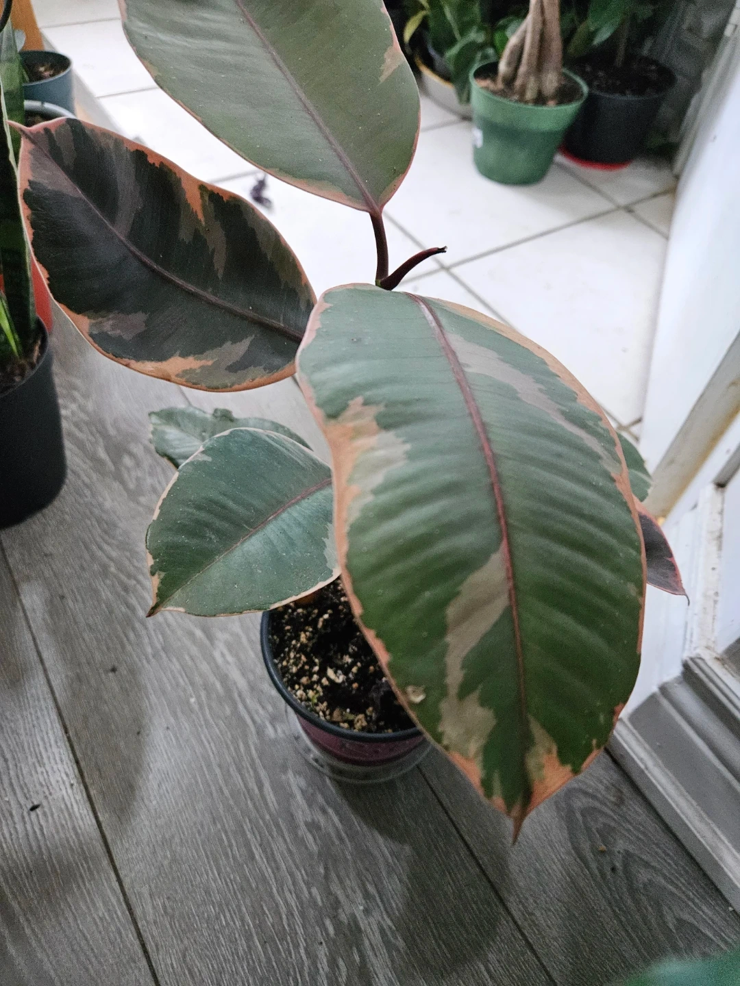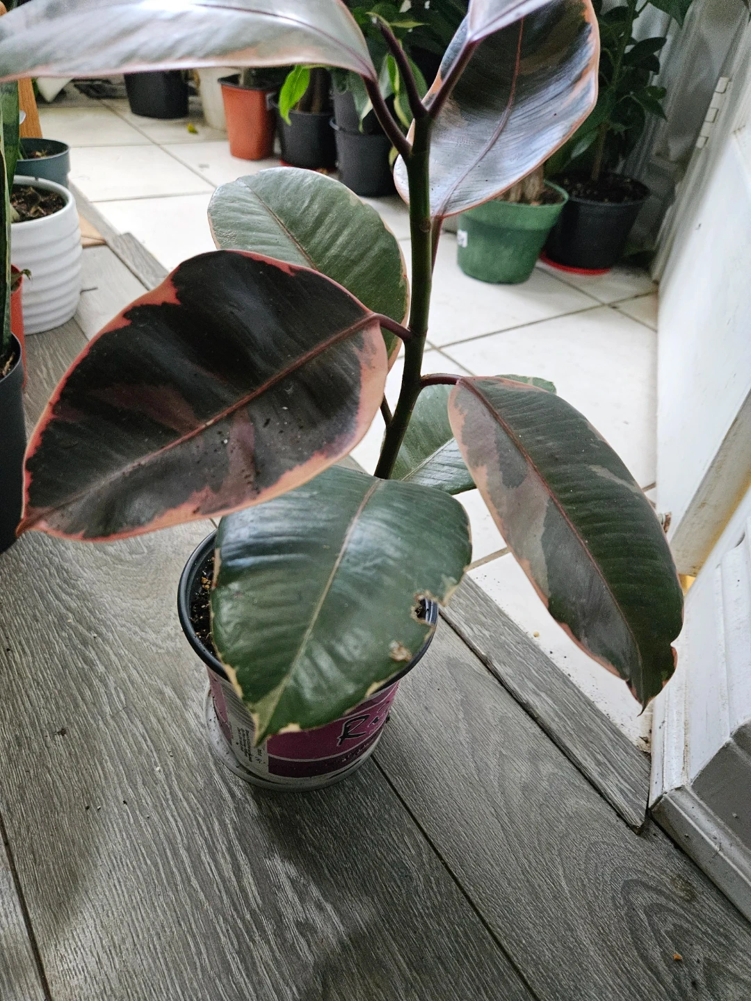 Selling a rubber plant. It's got beautiful leaves with pink edges! It's in good condition and ready to brighten up your space
