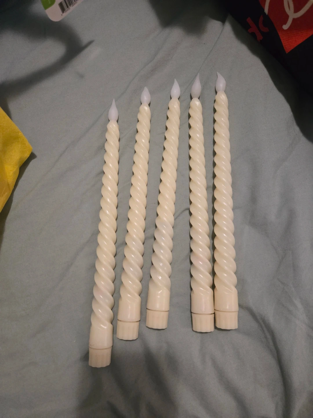 Selling a set of 5 LED taper candles. These are battery operated and give a nice warm glow without the worry of real flames. They have a twisted design and are in great condition