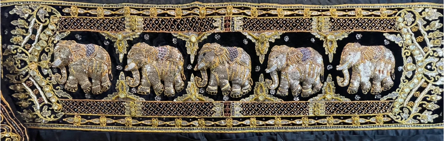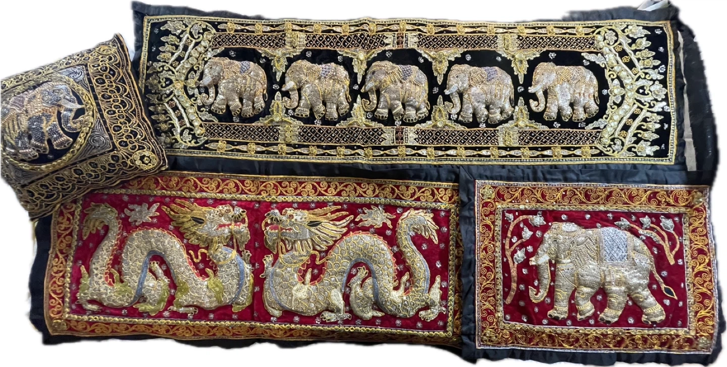 Selling a set of decorative textiles featuring intricate embroidery. The designs include elephants and dragons, with detailed beadwork and gold accents. Missing a few stones. Perfect for adding a unique touch to your home decor!
