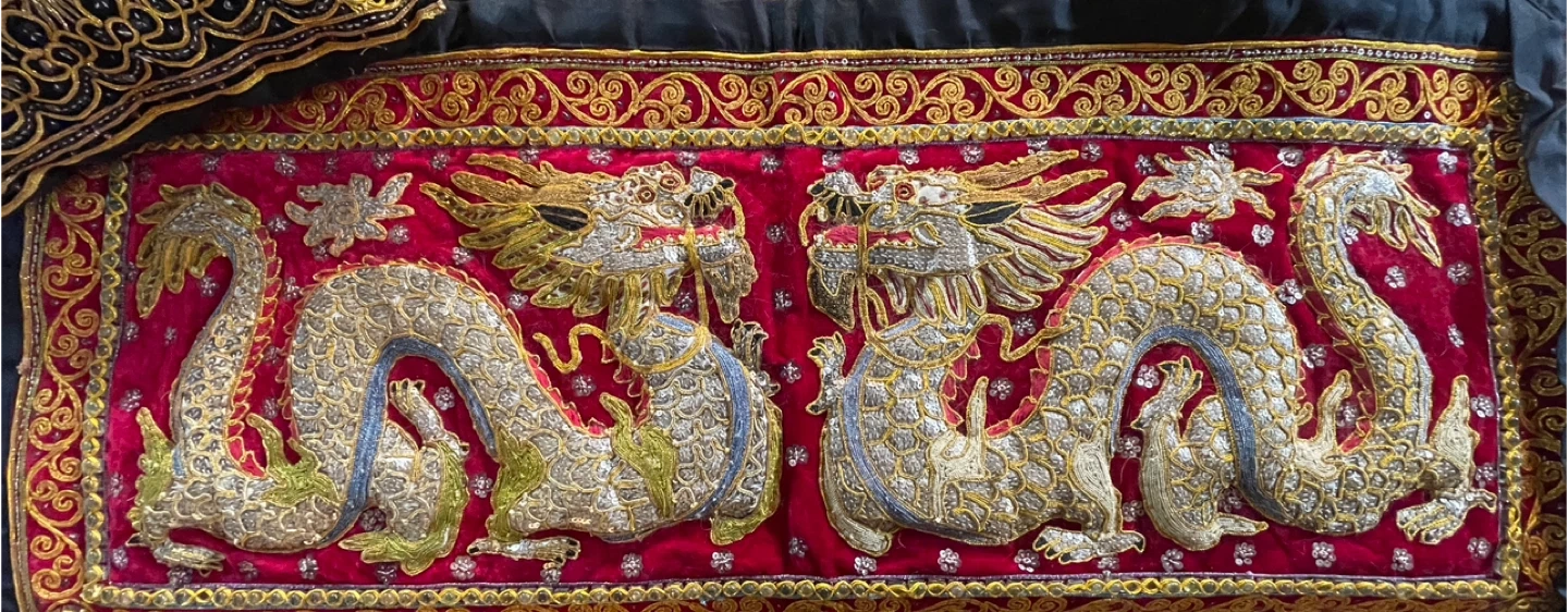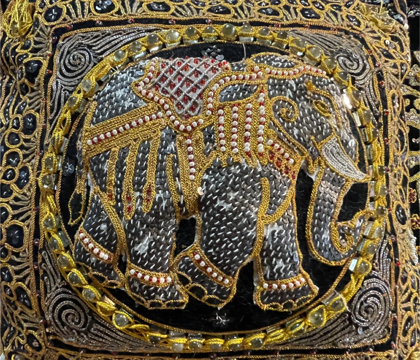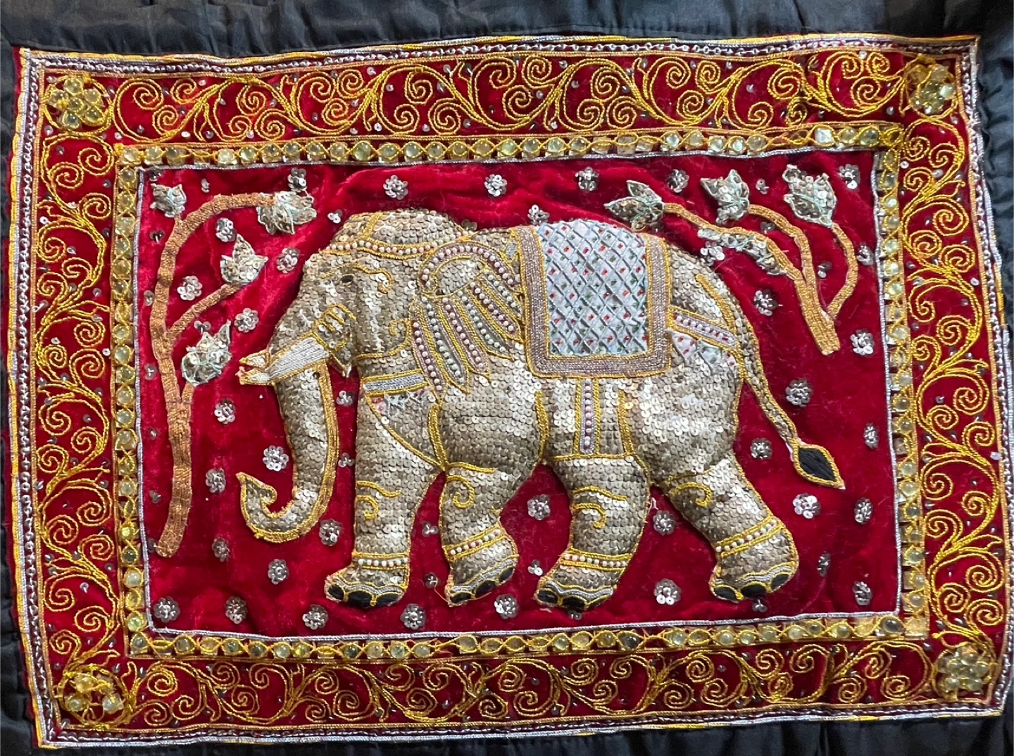Selling a set of decorative textiles featuring intricate embroidery. The designs include elephants and dragons, with detailed beadwork and gold accents. Missing a few stones. Perfect for adding a unique touch to your home decor!