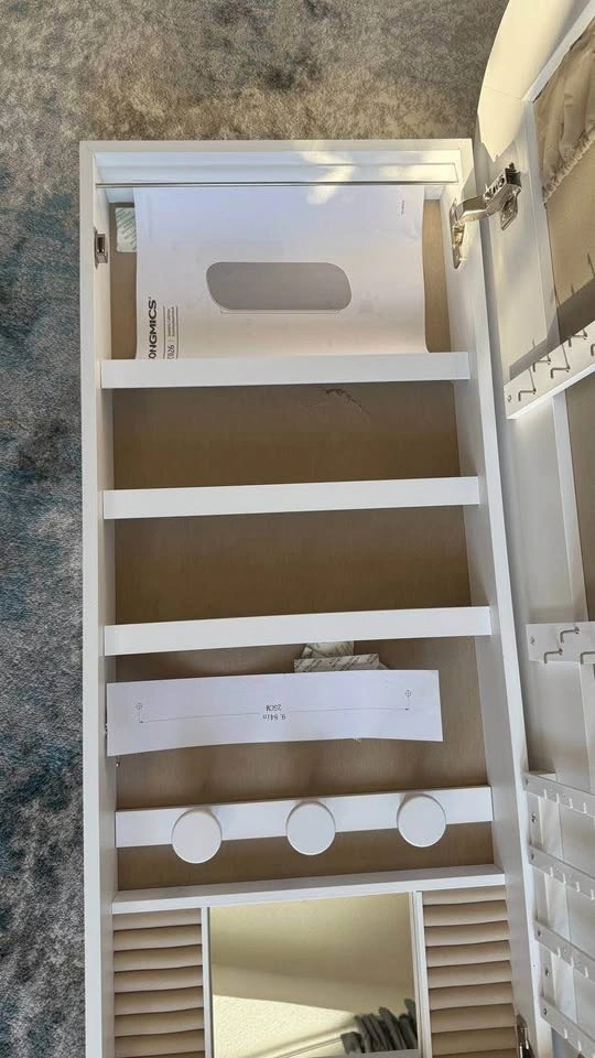With built-in LED lights, a full-length mirror, and tons of smart storage for jewelry and cosmetics, it’s a gorgeous upgrade for any bedroom or dressing space. Sleek white exterior + greige lining — stylish and modern.