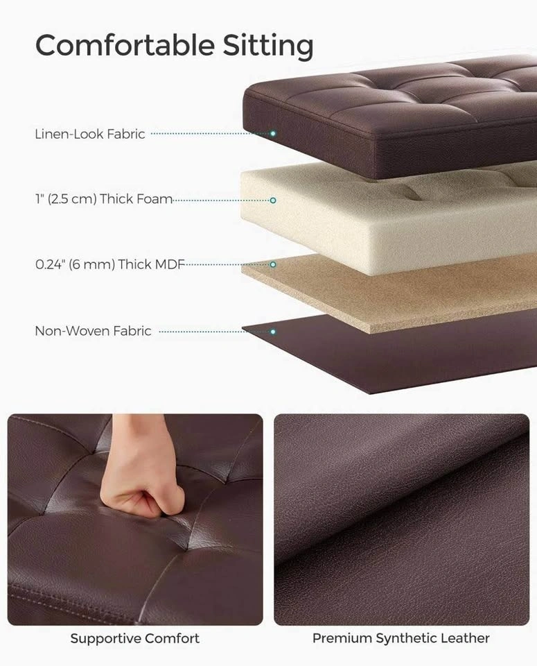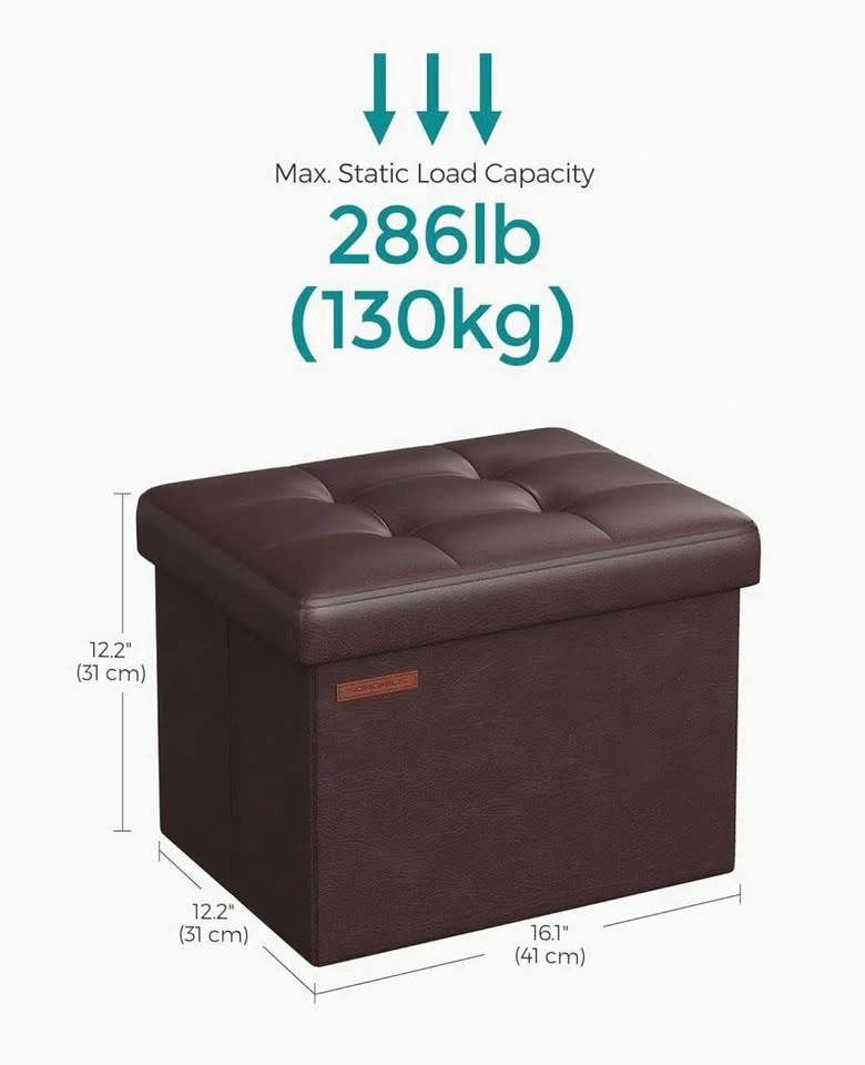 Compact yet sturdy, it supports up to 286 lb and folds flat when not in use. The chestnut brown synthetic leather looks elegant and fits beautifully in any living room, bedroom, dorm, or entryway.