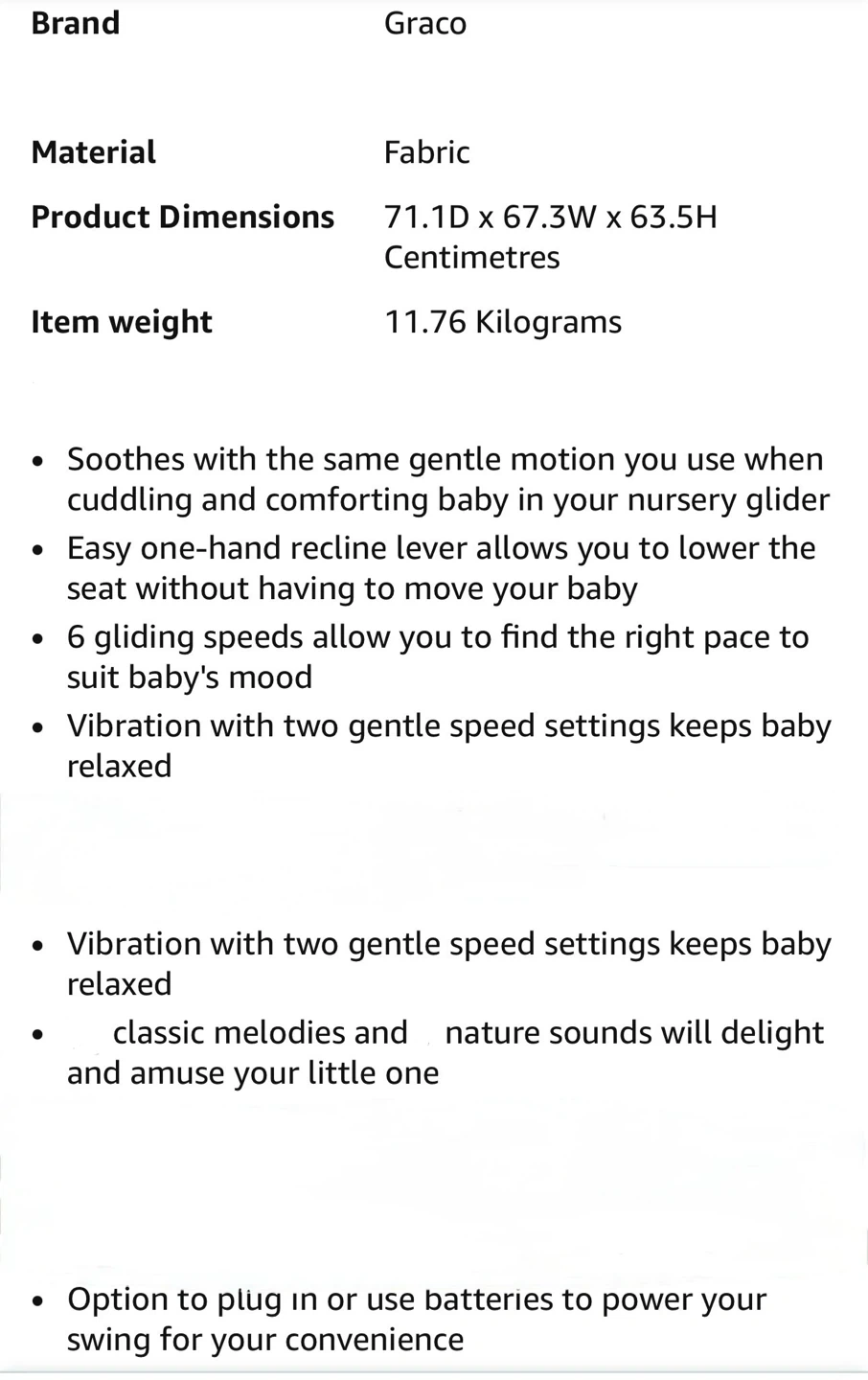 • 6 gliding speeds allow you to find the right pace to suit baby's mood