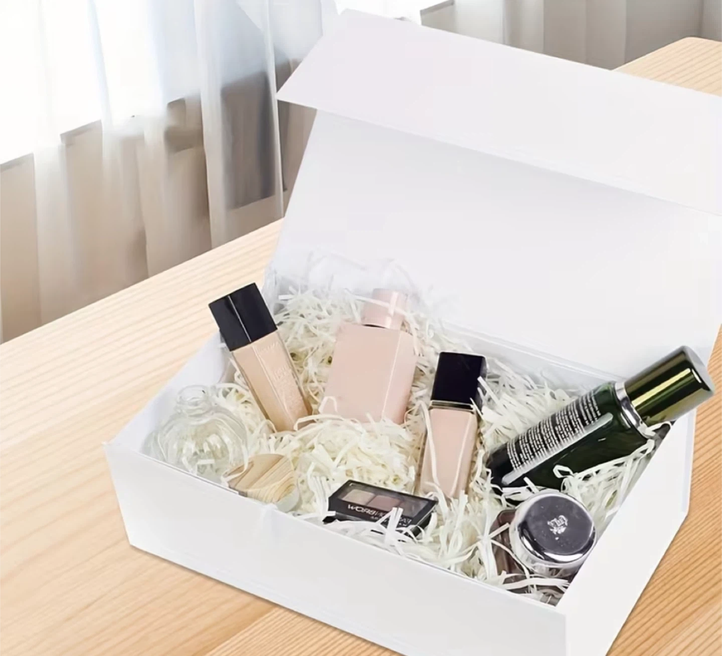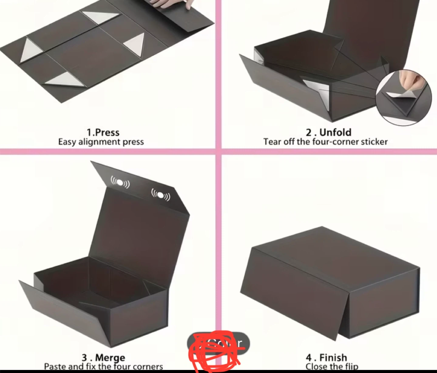 Selling a collapsible gift box! It's perfect for presenting gifts or storing items neatly. The box is easy to assemble with its simple press, unfold, merge, and finish steps. Great for any occasion!