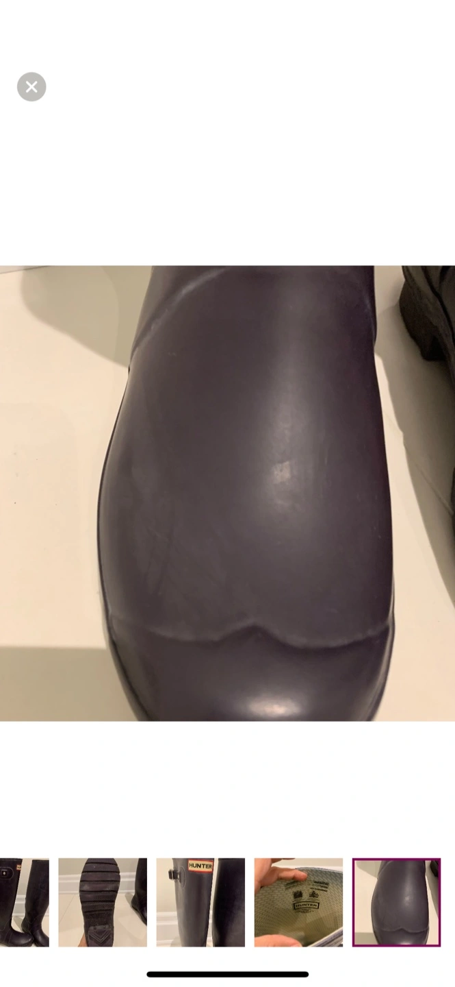Selling a pair of Hunter women's tall rain boots in a dark purple /gray colour. They are in excellent condition and ready for those rainy days!