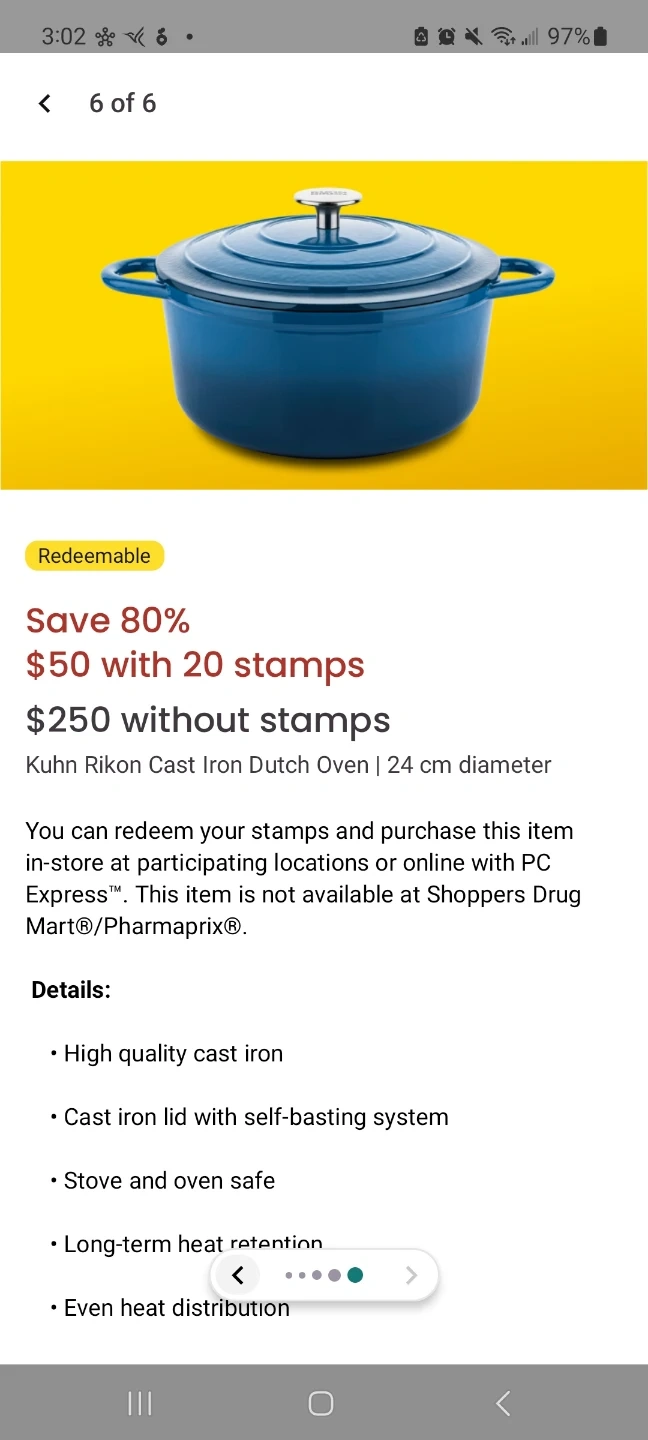 I'm selling a Kuhn Rikon Dutch Oven in blue. It's 9.4 inches in diameter and made of cast iron. It comes with its original box.