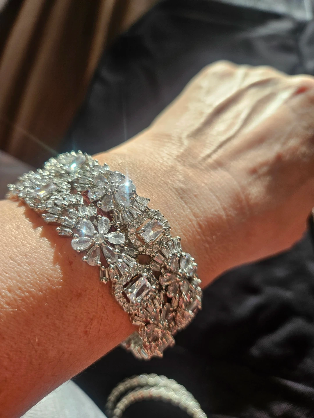 Selling a beautiful sparkly silver bracelet! The design features a mix of floral and geometric shapes, giving it a unique and eye-catching look. Very versatile.