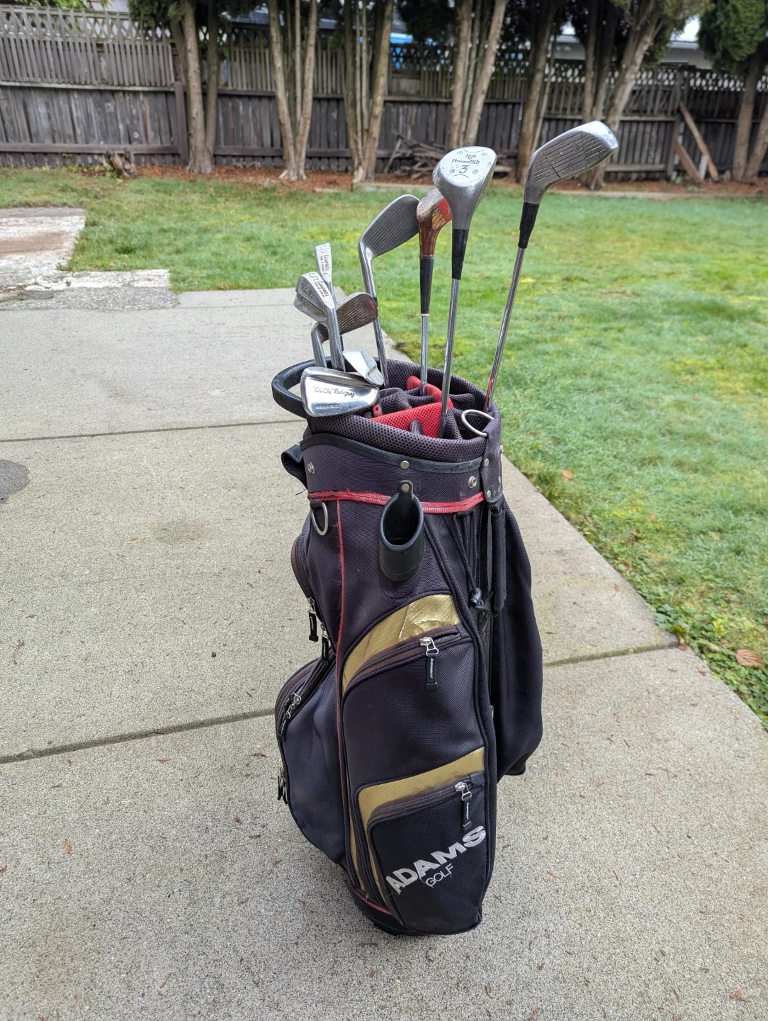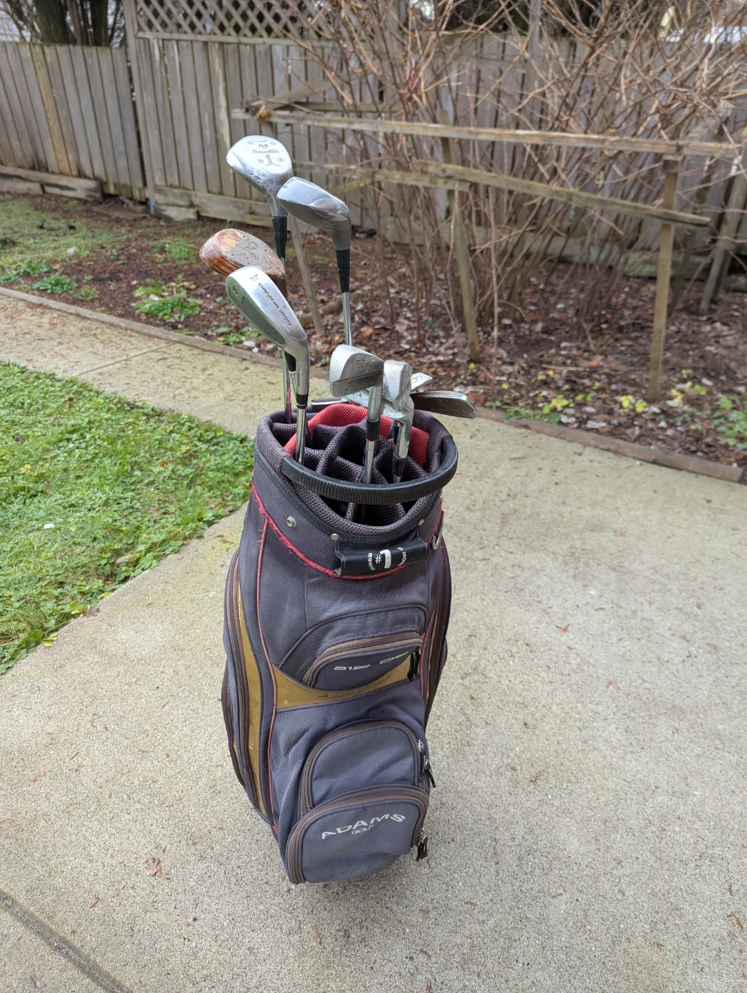Selling a used golf club set, complete with a golf bag. The set includes a variety of clubs for different shots and distances. Perfect for someone looking to get into golf or upgrade their current set!