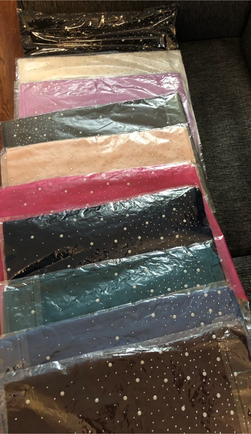 - Thin, black scarf/shawl with white pearls and small, silver rhinestones as embellishments. - Can also be used as a hijab or a dupatta! - Made from a cotton and viscose blend. - Care Instructions: Hand wash with cold water and lay flat to dry.