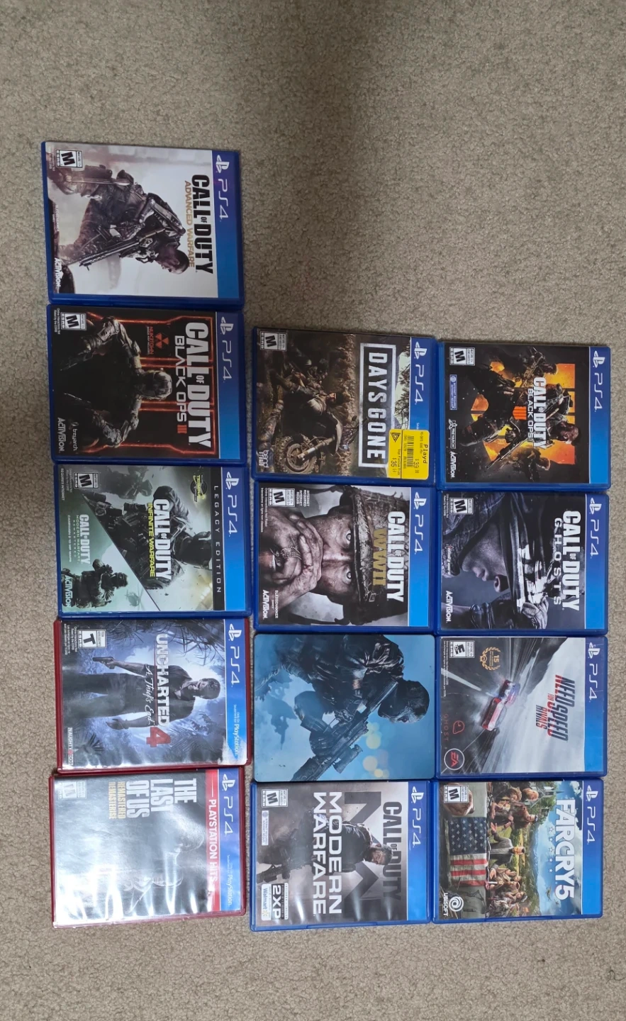 Selling a used like new PlayStation 4 (PS4). It's in good condition and ready for a new home. Includes a selection of games like Call of Duty, Days Gone, Uncharted, The Last of Us, and Far Cry 5 etc. PS4- $260 with all games $360.