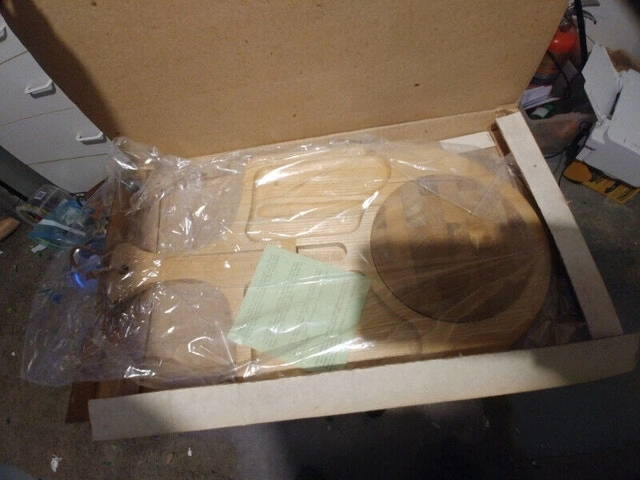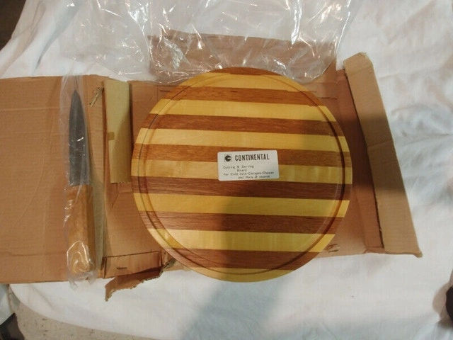 Up for sale we have a New Vintage Wood Cheese cutting board made with Japan Wood made in Japan. The board is 18 inches by 10 inches in brand new condition. It has an insert on the board to put a knife. I have 2 for sale at $25 each. You wont find anymore like these for sale, 2 of a kind.