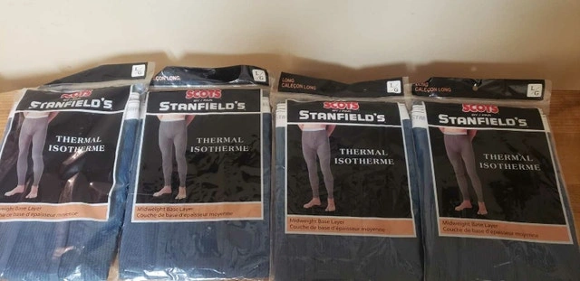 Up for sell we have these 4 new pairs of Scots Stanfield's navy long john large .... Asking $60 for the lot pick up on Beaverbrook Lane Kanata 50% cotton, 50% polyester Signature Stanfield's logo Waistband Flatlock seams that won't bind or chafe Snug fitting 1 x 1 rib knit Cuffs reinforced with spandex Machine washable and dryable