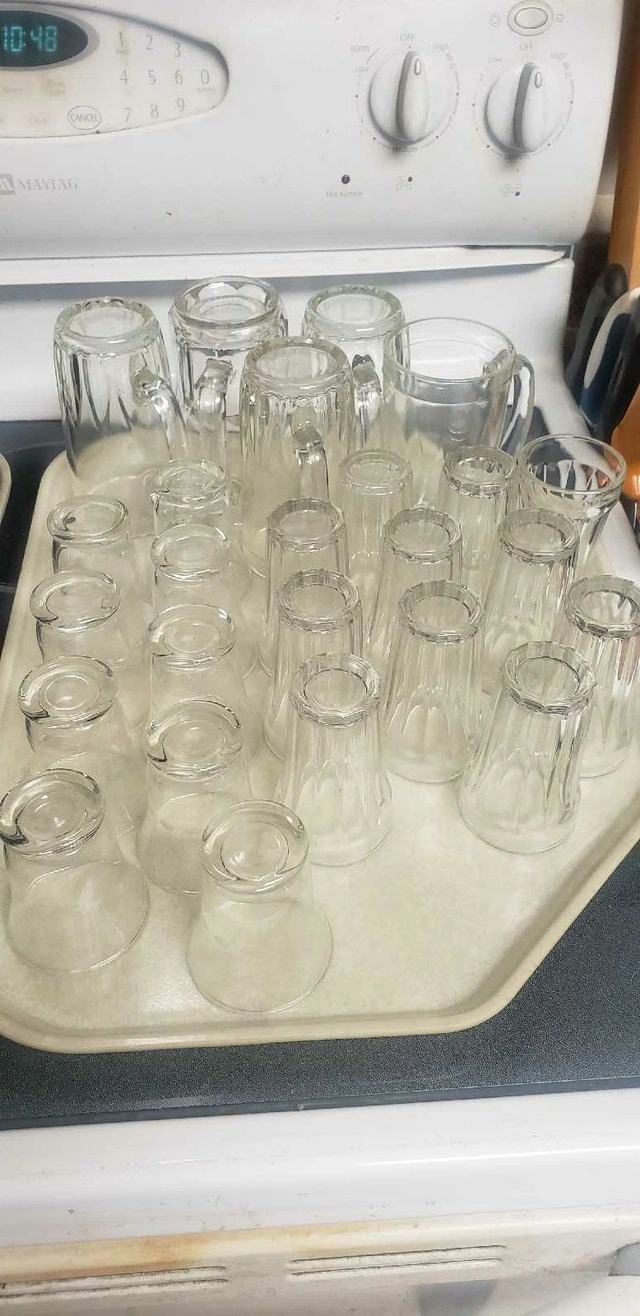 Up for sale we have this lot of 24 Vintage tavern juice, shots and beer mugs glass. The lot includes 5 x 5 1/4 tall by 3" wide tavern beer mugs, 10 x 3 3/4" tall juice or liquor shots and 9 x 3" tall juice glass all came from Douglas Tavern in Douglas On. Asking $50 for the lot pick up on beaverbrook lane in kanata thank you
