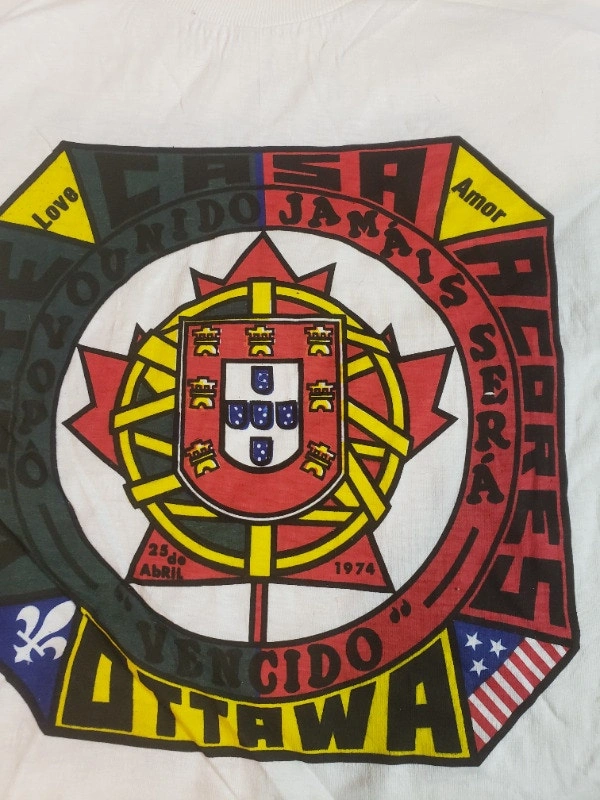 Up for sale we have some Vintage 1974 Ottawa T Shirts They Read ( O povo unido Jamais Sera Vencido Abril 25 1975 To Celebrate The Carnation Revolution (Portuguese: Revolução dos Cravos), also known as the 25 April (Portuguese: 25 de Abril), was initially a 25 April 1974 military coup in Lisbon which overthrew the authoritarian Estado Novo regime.[1] The revolution began as a coup organised by the Armed Forces Movement (Portuguese: Movimento das Forças Armadas, MFA), composed of military officers who opposed the regime, but it was soon coupled with an unanticipated, popular civil resistance campaign. The revolution led to the fall of the Estado Novo, terminated the Portuguese Colonial War, and started a revolutionary process that would result in a democratic Portugal. Its name arose from the fact that almost no shots were fired, and Celeste Caeiro offered carnations to the soldiers when the population took to the streets to celebrate the end of the dictatorship; other demonstrators followed suit, and carnations were placed in the muzzles of guns and on the soldiers' uniforms.[2] In Portugal, 25 April is a national holiday (Portuguese: Dia da Liberdade, Freedom Day) which commemorates the revolution. Asking $5 each Pick up on Old Richmons Road in Nepean