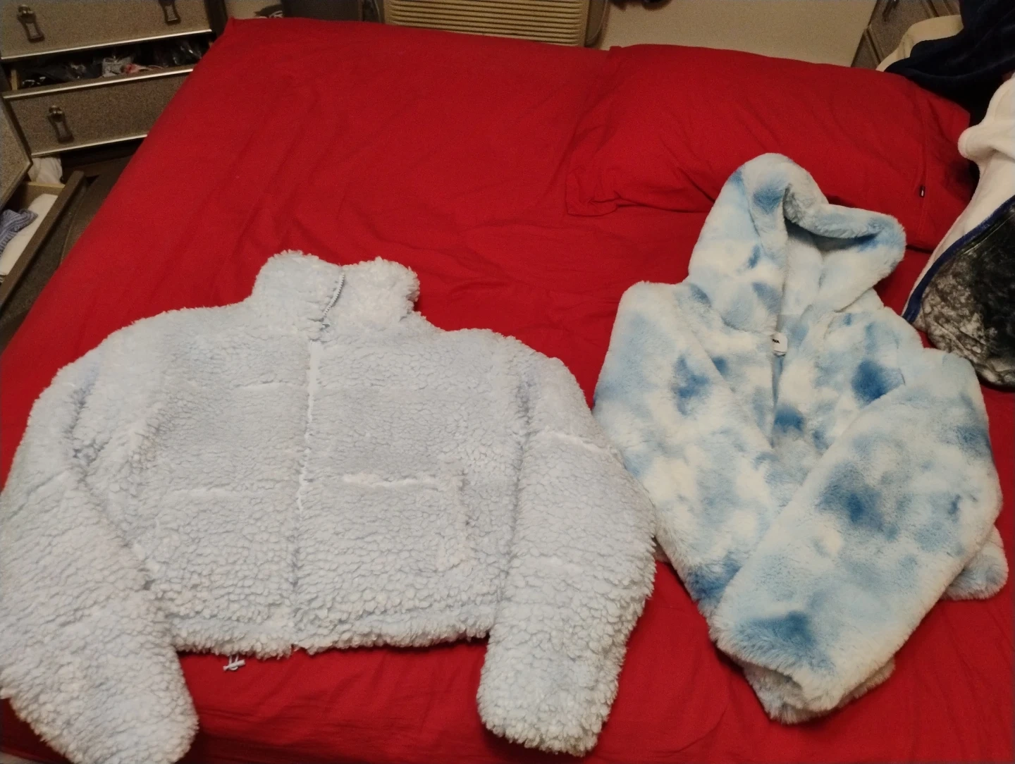 Selling a couple of fuzzy jackets! One is a solid light blue cropped jacket and the other is a blue and white tie dye hooded jacket. Both are in good condition and ready for a new owner! Pick up only,,, excellent condition,,the one with the hoodie was never worn,,the otha one once,,make me an offer