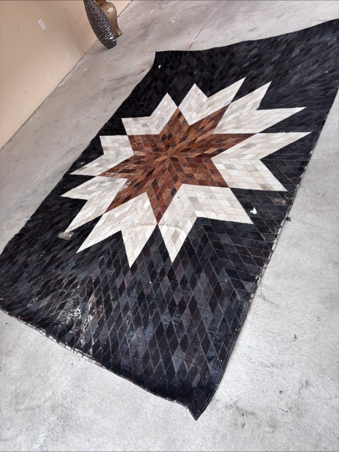 Selling a unique cowhide rug featuring a star design! The rug has a black, white, and brown colour scheme.