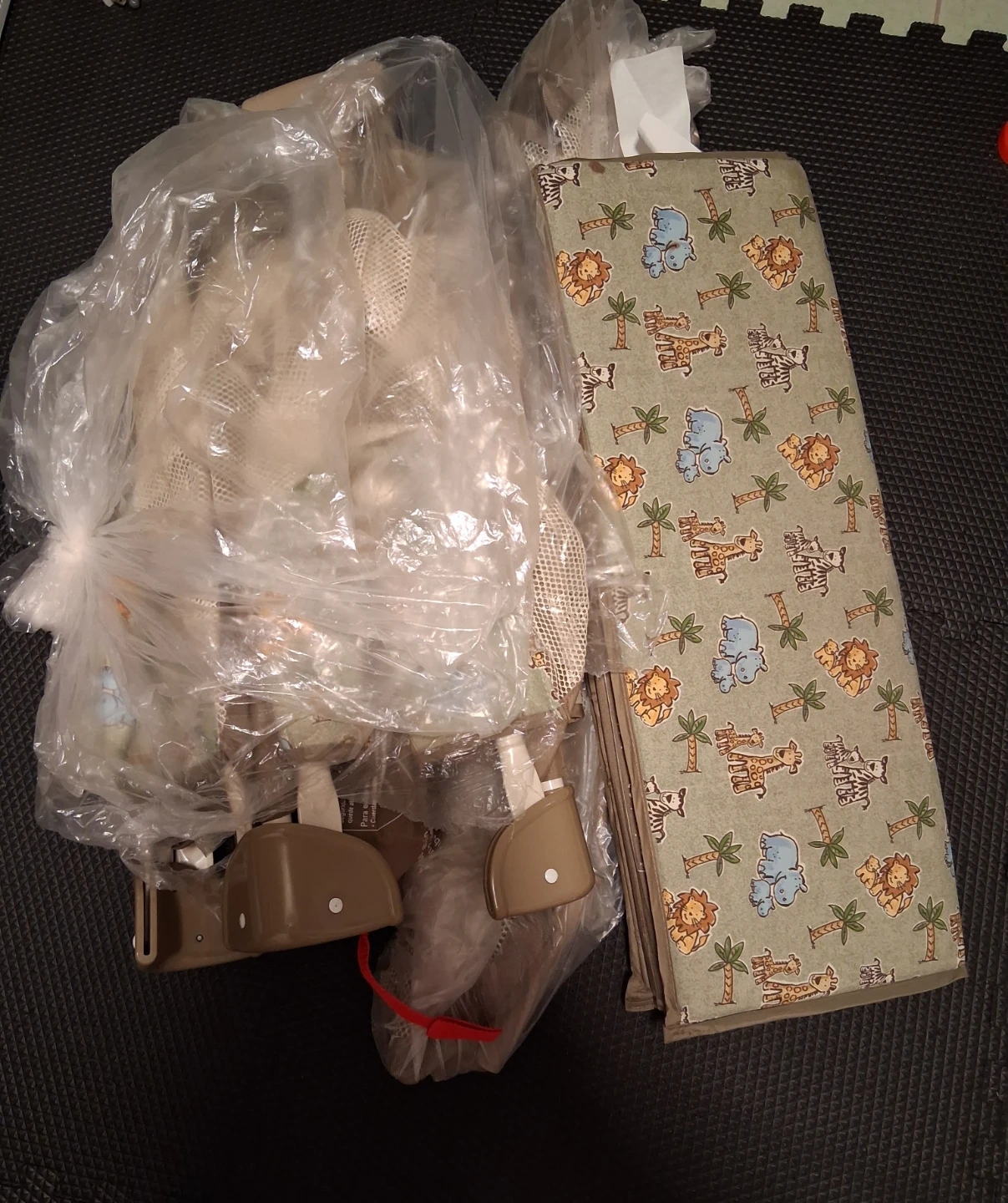 Free baby bassinet that comes with a mattress featuring a cute jungle print with lions, elephants, giraffes and zebras. It appears to be in good condition and is partially disassembled and wrapped in plastic for easy transport.