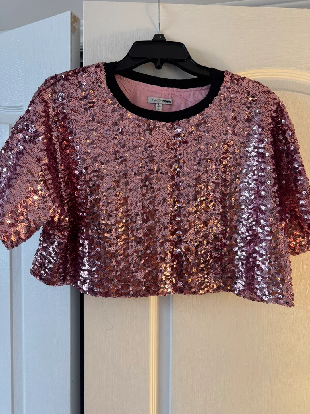 Selling a cute Fashion Nova sequin crop top! It's a size large and features a stylish black neckline. Perfect for adding some sparkle to your wardrobe!