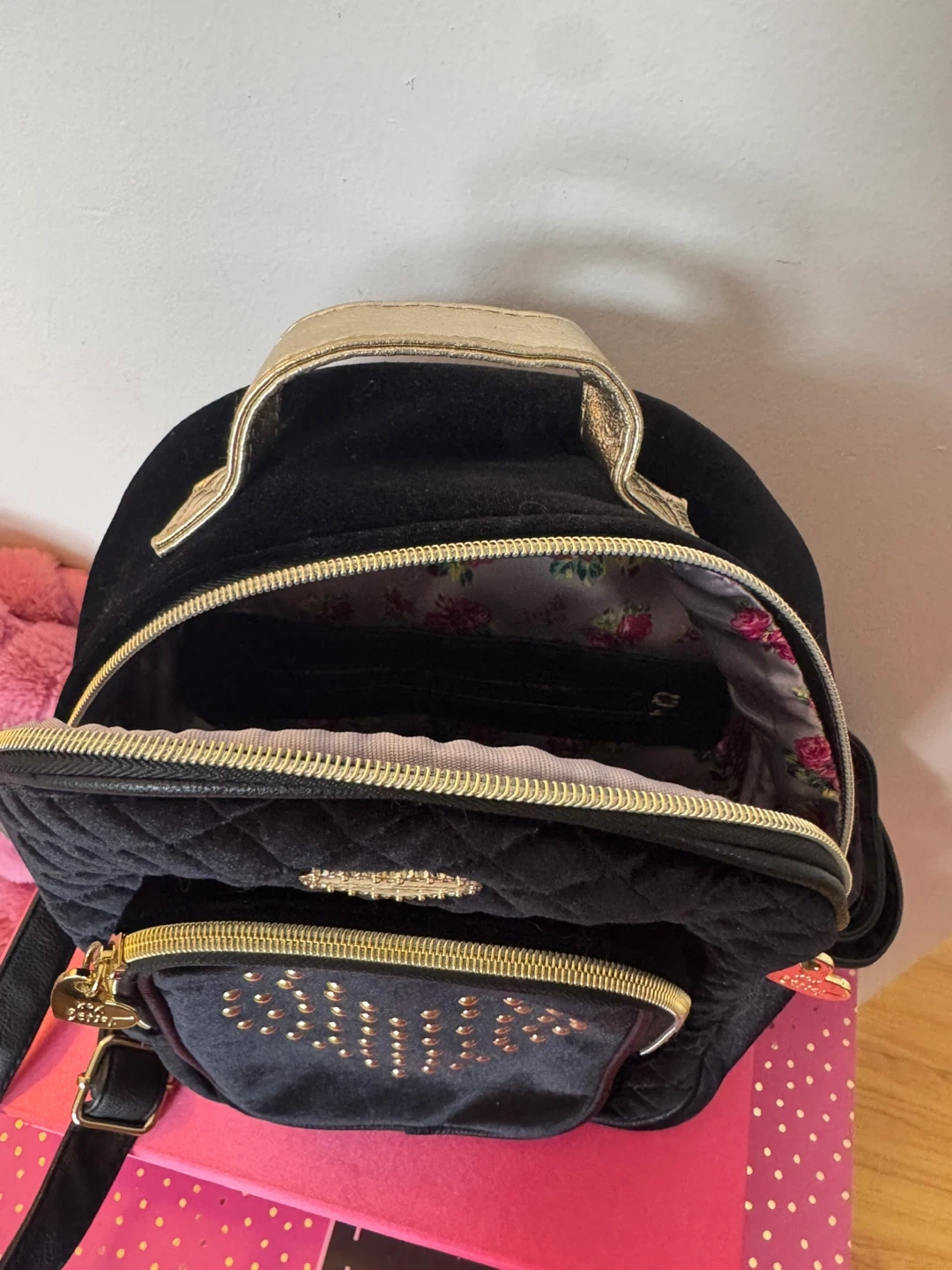 This is a cute Betsey Johnson black velvet backpack with a gold heart design. It's perfect for adding a touch of sparkle to your outfit. The backpack is in great condition and ready for a new adventure!