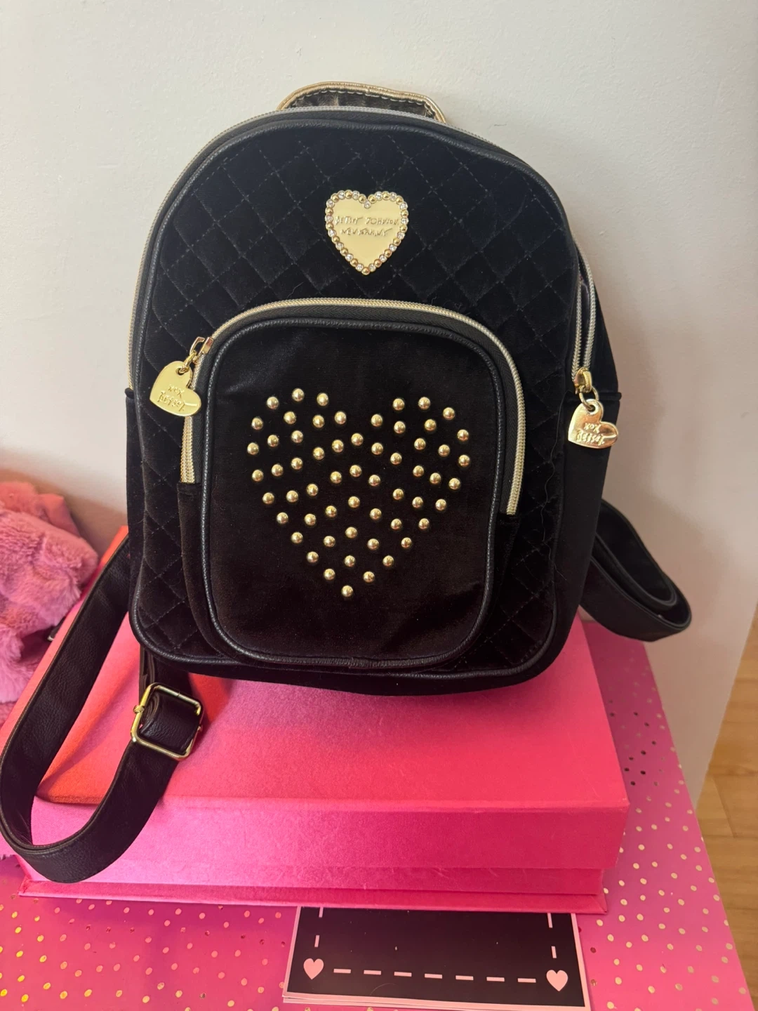 This is a cute Betsey Johnson black velvet backpack with a gold heart design. It's perfect for adding a touch of sparkle to your outfit. The backpack is in great condition and ready for a new adventure!