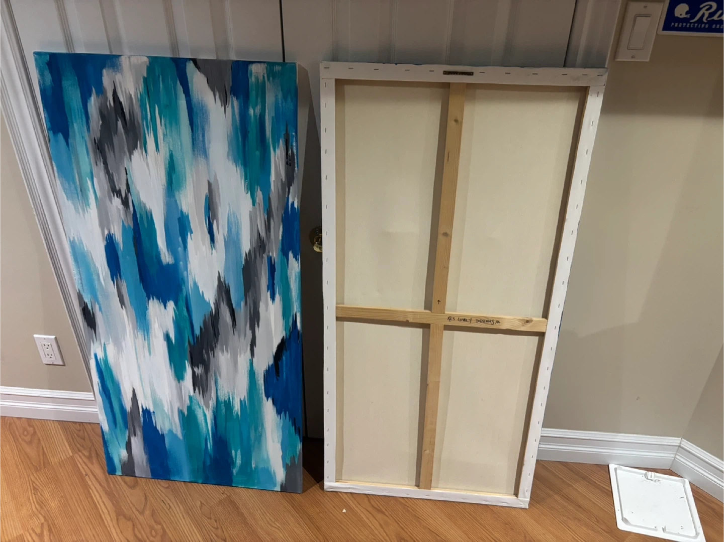 Selling two abstract canvas paintings, featuring a blend of blue, white, and grey hues. Perfect for adding a modern touch to any room. The artist is GS Lovely Designs.