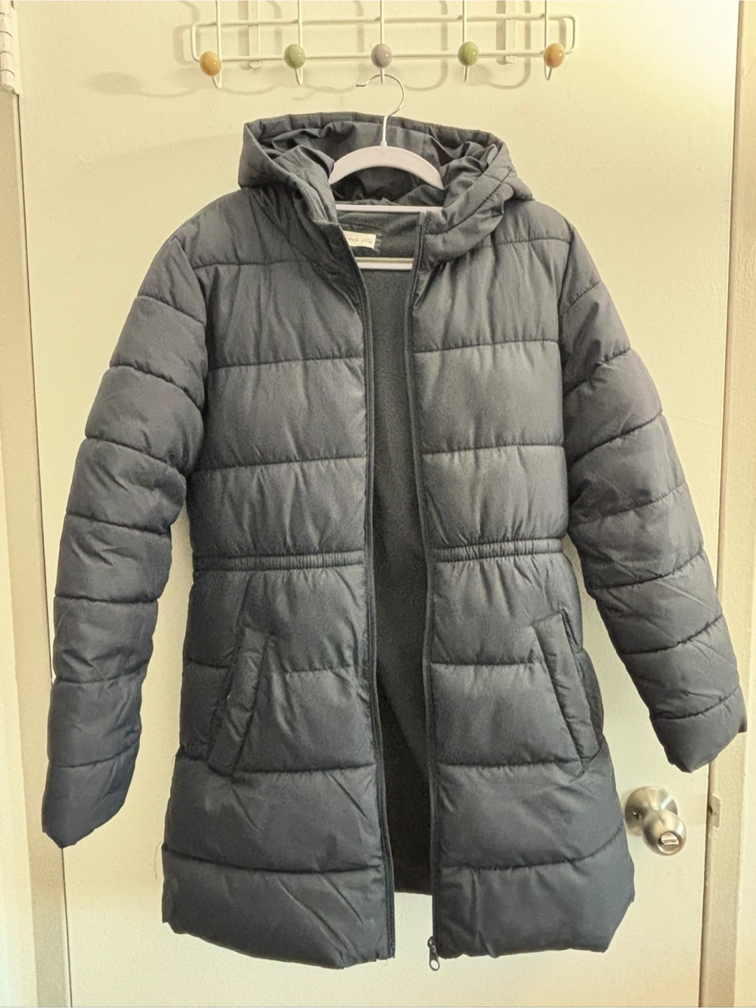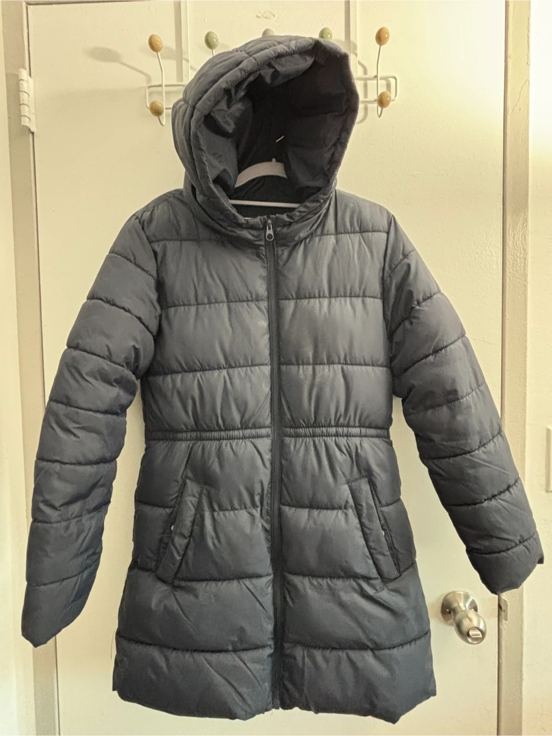 Here's a girls' puffer jacket, perfect for keeping warm! It's a age13-14 and in great condition. This stylish and cozy jacket is ready for a new owner!