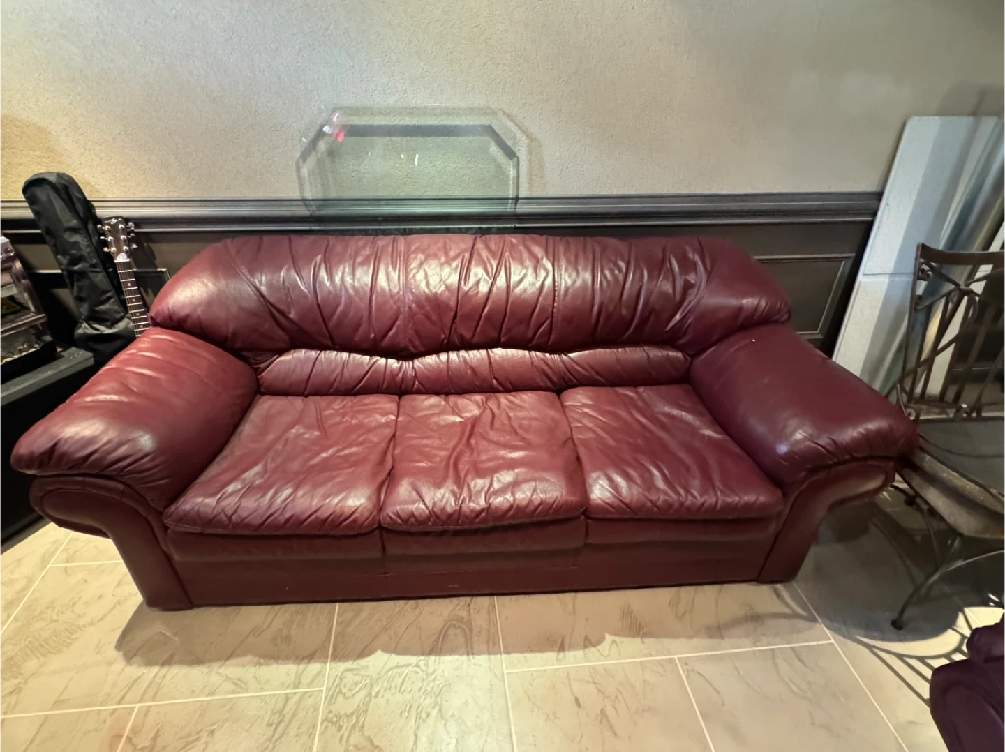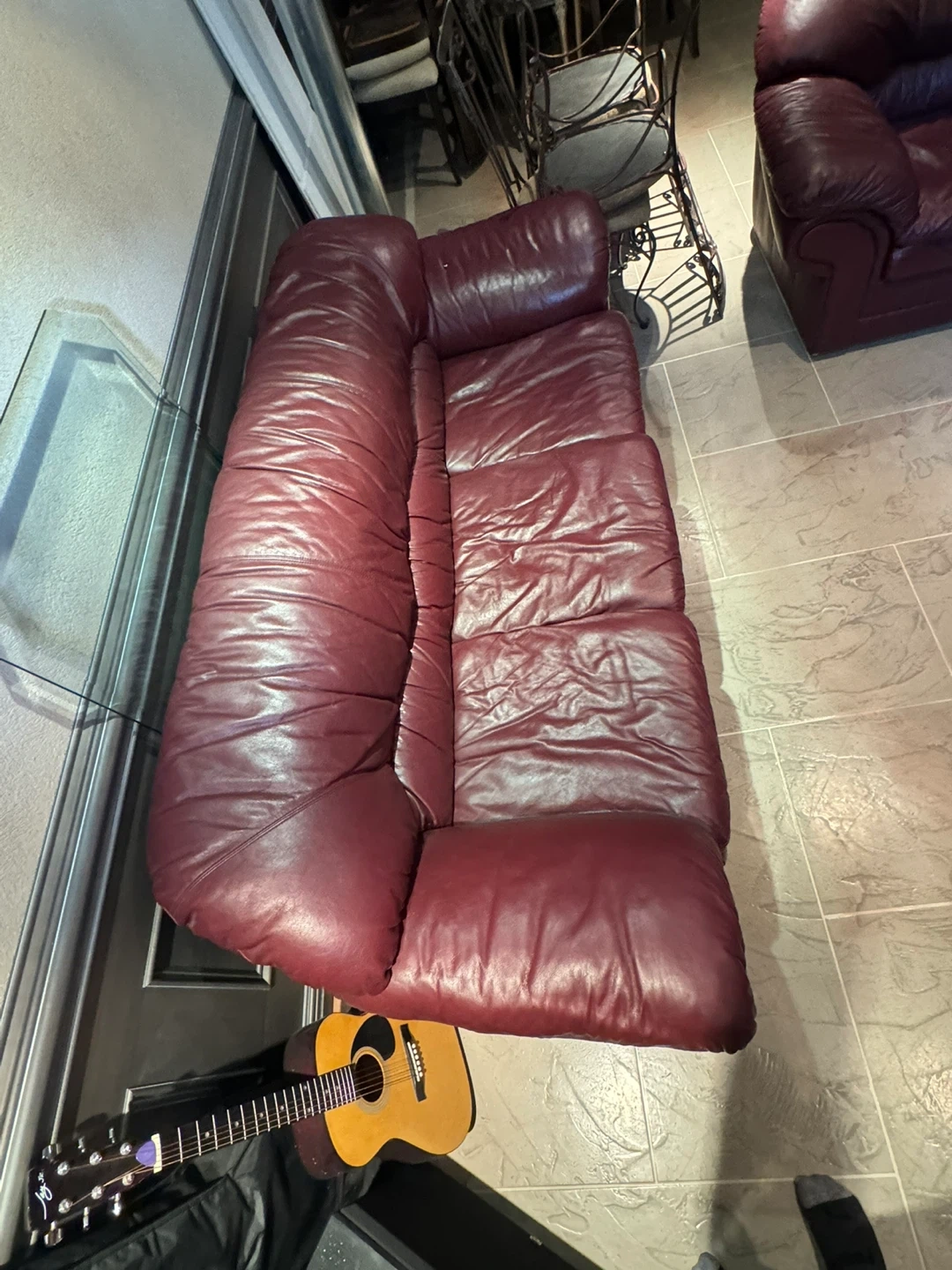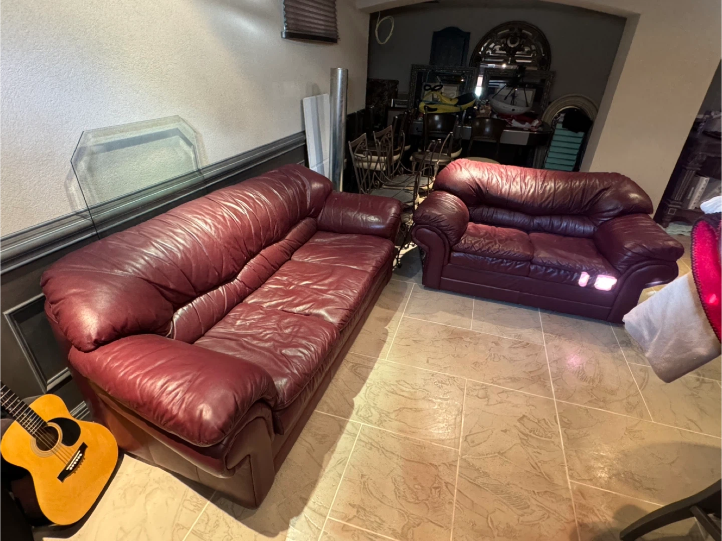 Selling a burgundy leather sofa set. The set includes a three-seater sofa and a loveseat. They're well-loved and ready for a new home!