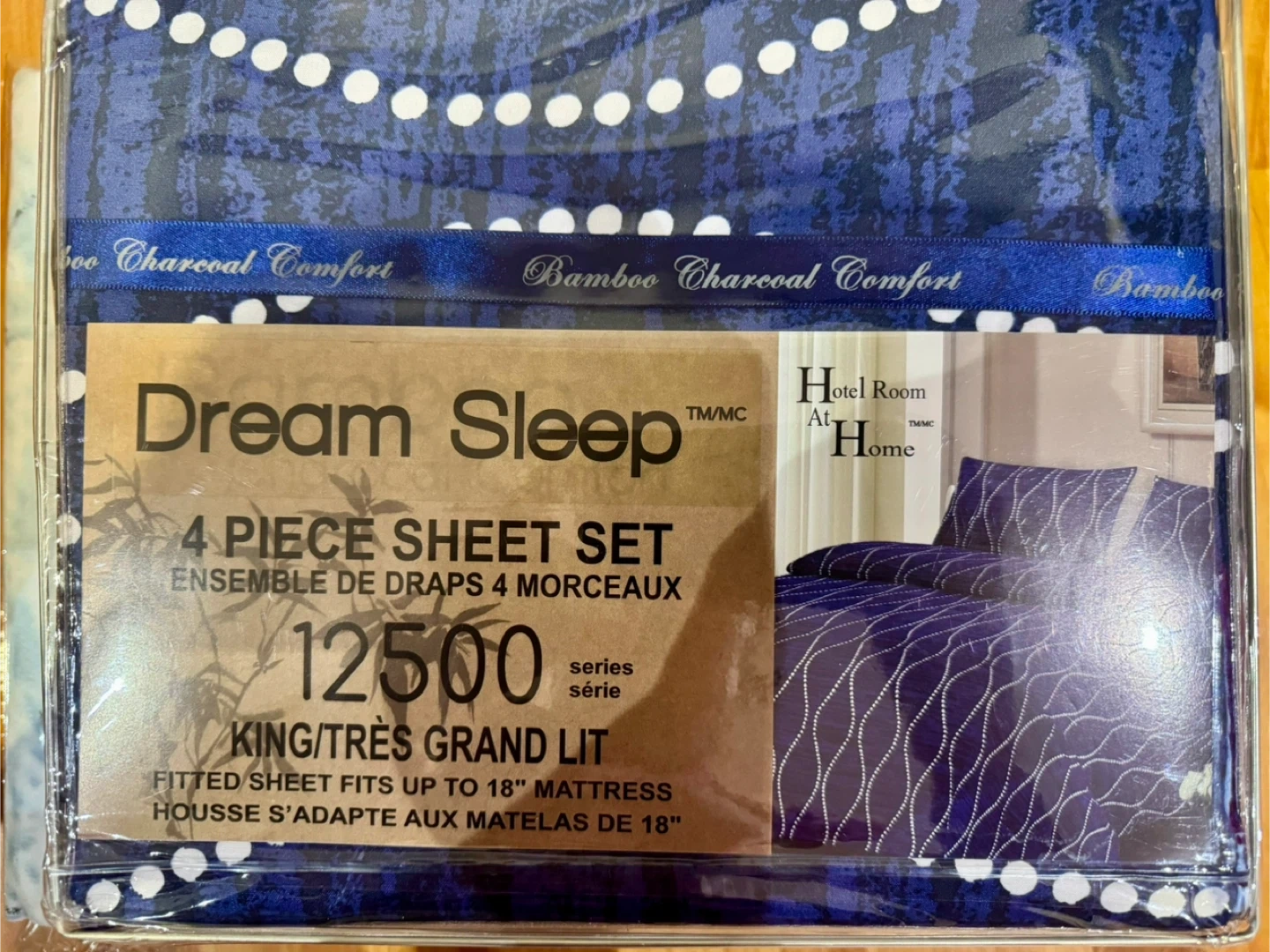 Selling a brand new Dream Sleep 4-piece sheet set in King size! This set is part of the 12500 series and is designed to fit mattresses up to 18 inches. The set includes a fitted sheet, flat sheet, and two pillowcases. The packaging mentions 'Bamboo Charcoal Comfort' so it might be a blend of bamboo and charcoal fibres for extra comfort and breathability