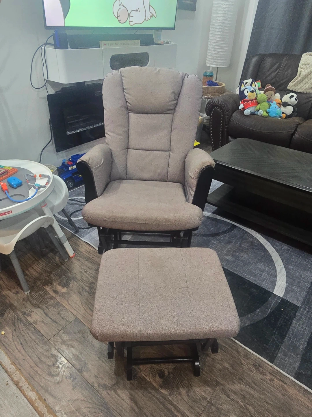 Selling a glider rocking chair with a matching ottoman. It's in good condition and would be great for a nursery or living room. The chair has a smooth gliding motion for ultimate relaxation!