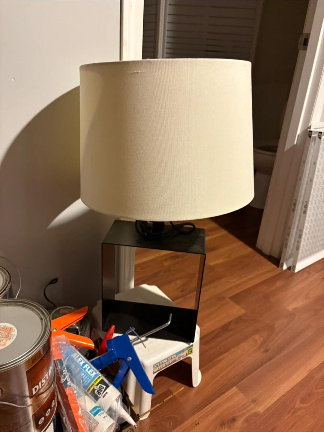 Selling a table lamp with a white shade. It features a black, mirrored base. The lamp is in good condition and would be a nice addition to any room. As is, pick up only.