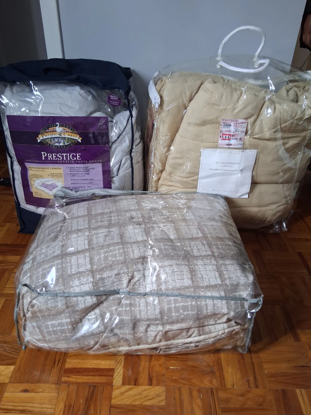 Selling a Pacific Coast Prestige Queen comforter set. It's a 6/7-piece comforter set, still in its original packaging. The comforter has a 370 thread count and features Comfort Lock border and anti-allergy guarantee. 3 comforters.