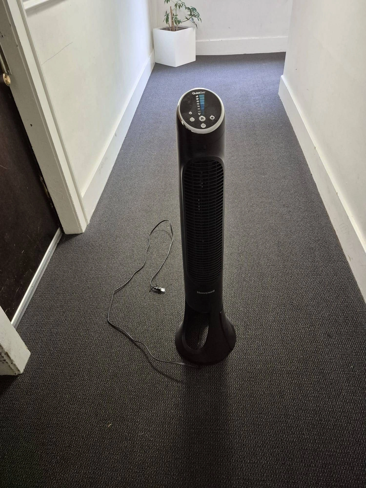 Works well, has a broken part on the leg that can be easily glued/strapped, still stands still perfectly. Selling it because I'm moving to an apartment with AC.