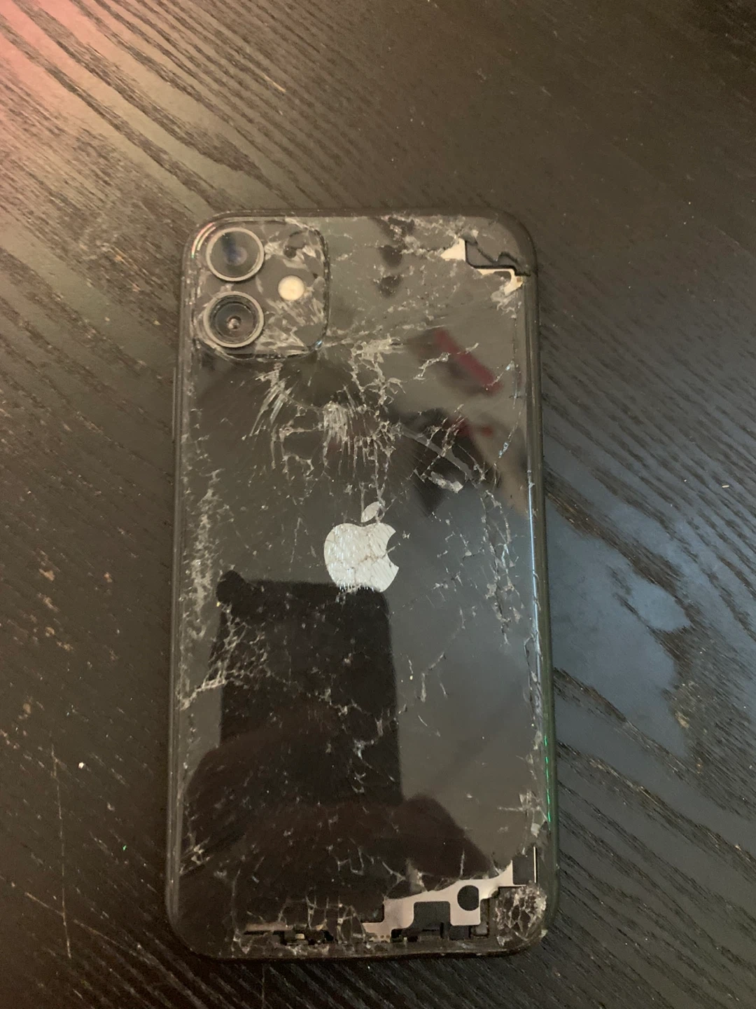 Selling a cracked iPhone. It's definitely seen better days, as you can see. The screen is cracked and the back is shattered. Selling as is. Parts. iCloud locked