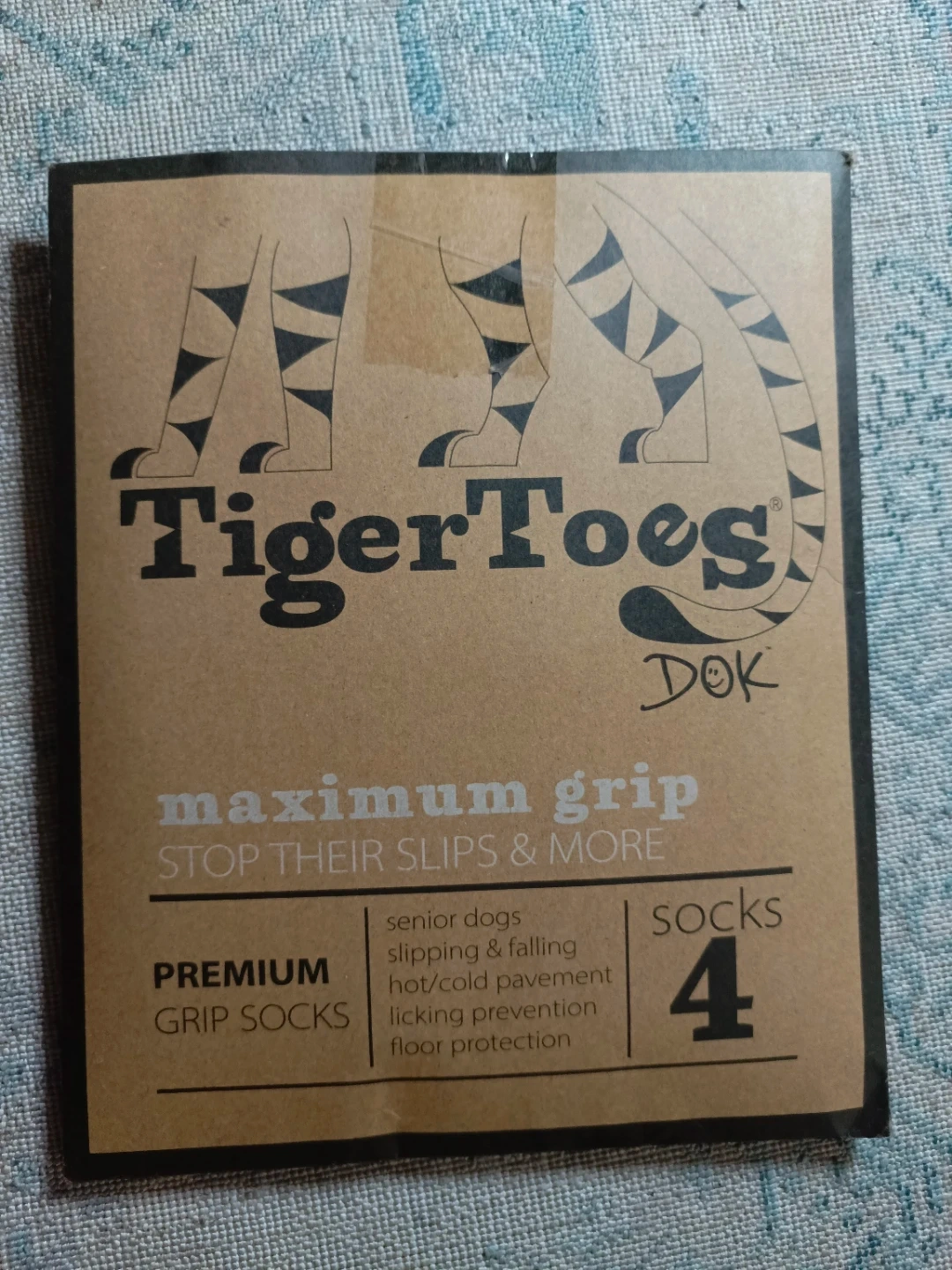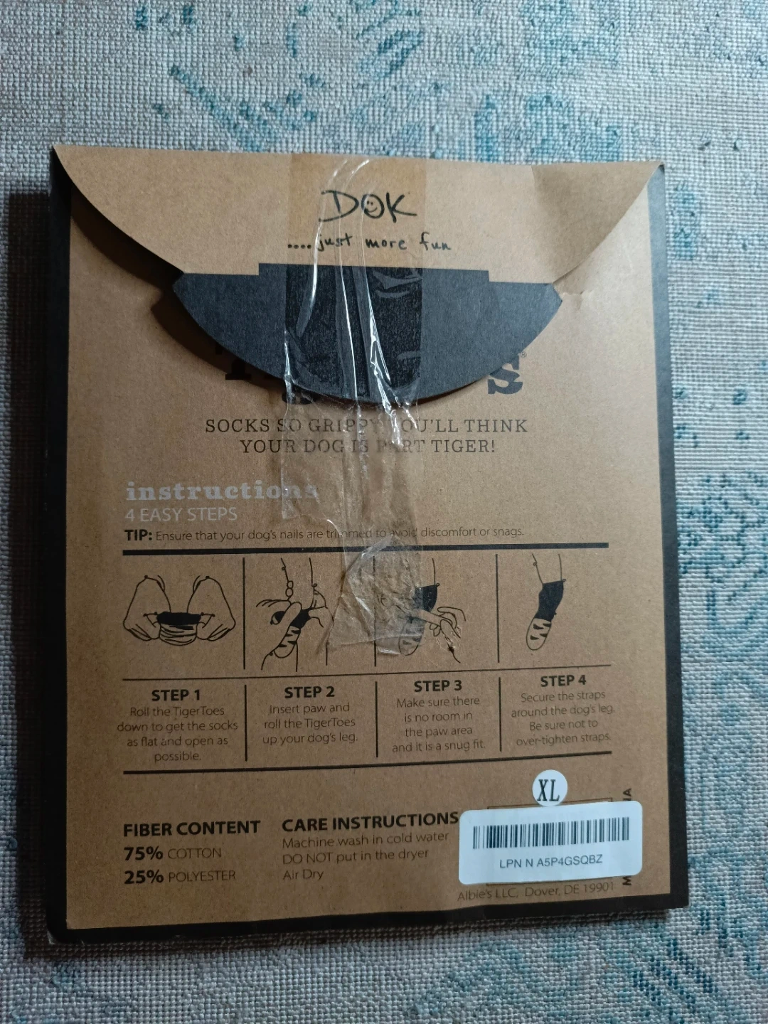 Keep your senior dog safe and comfortable with these TigerToes DOK grip socks! These premium grip socks are designed to prevent slipping and falling, protect paws from hot/cold pavement, and discourage licking. They're size XL and made from 75% cotton and 25% polyester. The packaging includes easy step-by-step instructions for putting them on your furry friend